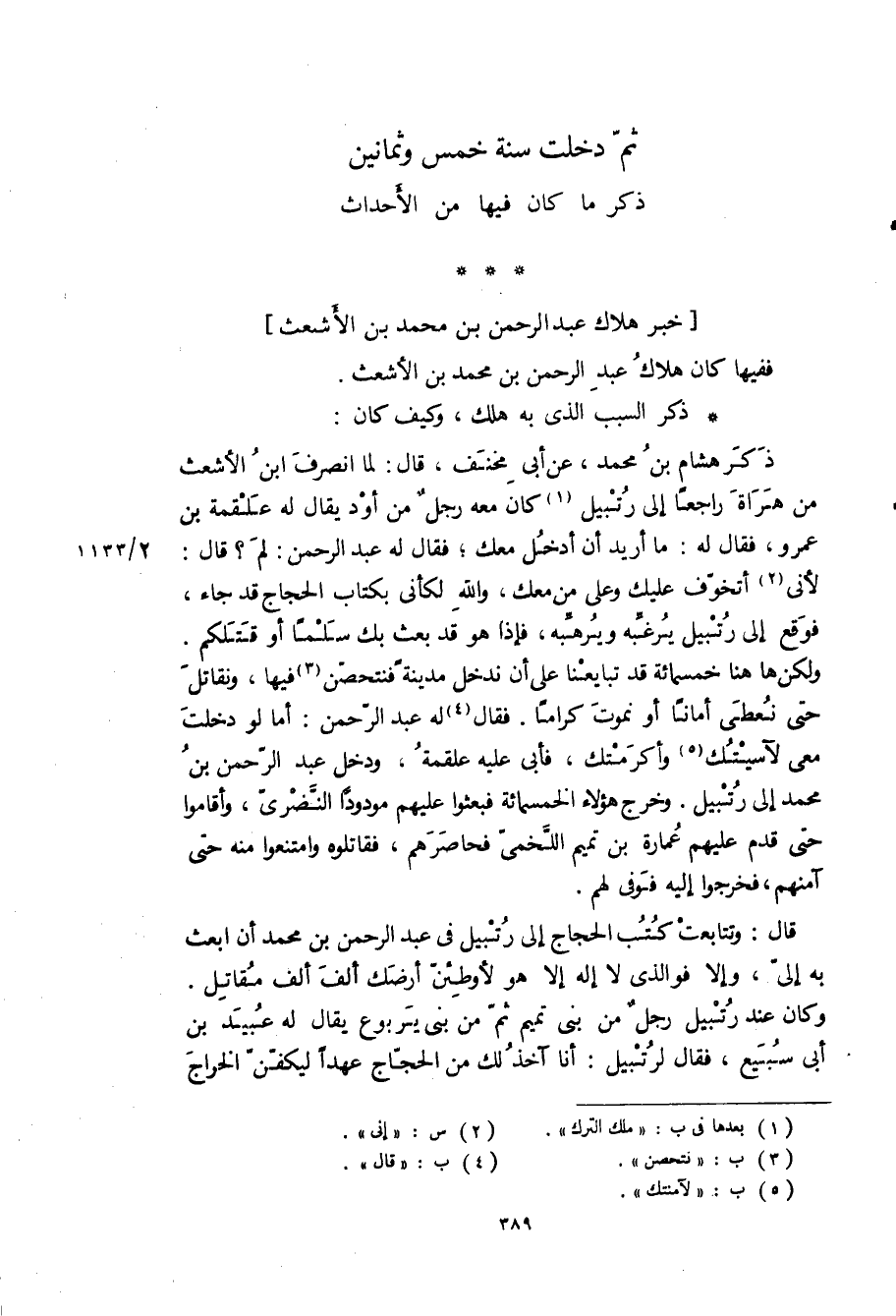ولكن هاهنا خمسمائة قد تبايعنا على أن ندخل مدينة فنتحصن فيها، ونقاتل حتى نعطي أمانا أو نموت كراما، فقال له عبد الرحمن: أما لو دخلت معي لآسيتك وأكرمتك، فأبى عليه علقمة، ودخل عبد الرحمن بن مُحَمَّد إلى رتبيل وخرج هؤلاء الخمسمائة فبعثوا عليهم مودودا النضري، وأقاموا حتى قدم عليهم عمارة بن تميم اللخمي فحاصرهم، فقاتلوه وامتنعوا منه حتى آمنهم، فخرجوا إليه فوفي لهم.