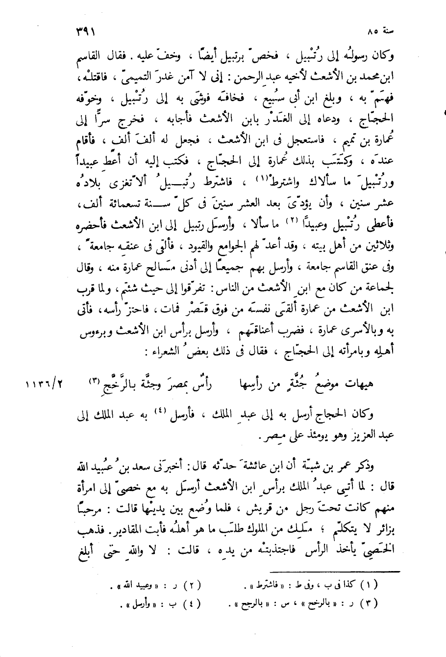 وكان رسوله إلى رتبيل، فخص برتبيل أيضا، وخف عليه فقال القاسم ابن مُحَمَّد بن الأشعث لأخيه عبد الرحمن: إني لا آمن غدر التميمي، فاقتله، فهم به، وبلغ ابن أبي سبيع، فخافه فوشى به إلى رتبيل، وخوفه الحجاج، ودعاه إلى الغدر بابن الأشعث فأجابه، فخرج سرا إلى عمارة بن تميم، فاستعجل في ابن الأشعث، فجعل له ألف ألف، فأقام عنده، وكتب بذلك عمارة إلى الحجاج، فكتب إليه أن أعط عبيدا ورتبيل ما سالاك واشترط، فاشترط رتبيل الا تغزى بلاده عشر سنين، وأن يؤدي بعد العشر سنين في كل سنه تسعمائة ألف، فأعطى رتبيل وعبيدا ما سألا، وأرسل رتبيل إلى ابن الأشعث فأحضره وثلاثين من أهل بيته، وقد أعد لهم الجوامع والقيود، فألقى في عنقه جامعة، وفي عنق القاسم جامعة، وأرسل بهم جميعا إلى أدنى مسالح عمارة منه، وقال لجماعة من كان مع ابن الأشعث من الناس: تفرقوا إلى حيث شئتم، ولما قرب ابن الأشعث من عمارة ألقى نفسه من فوق قصر فمات، فاحتز رأسه، فأتى به وبالأسرى عمارة، فضرب أعناقهم، وأرسل برأس ابن الأشعث وبرءوس أهله وبامرأته إلى الحجاج، فقال في ذلك بعض الشعراء:
