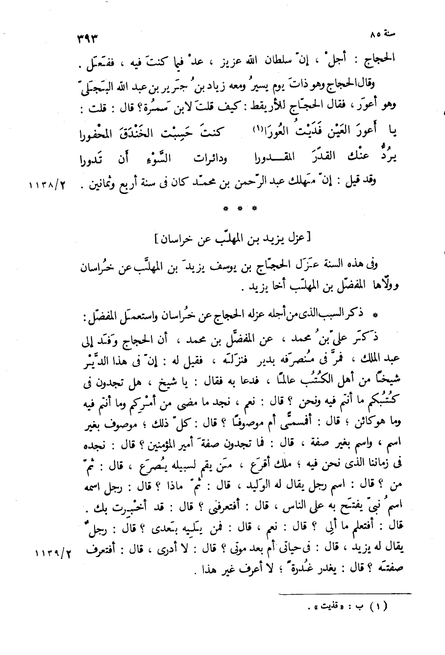 ذكر علي بن مُحَمَّد، عن المفضل بن مُحَمَّد، أن الحجاج وفد إلى عبد الملك، فمر في منصرفه بدير فنزله، فقيل له: إن في هذا الدير شيخا من أهل الكتب عالما، فدعا به فقال: يا شيخ، هل تجدون في كتبكم ما أنتم فيه ونحن؟ قال: نعم، نجد ما مضى من أمركم وما أنتم فيه وما هو كائن، قال: أفمسمى أم موصوفا؟ قال: كل ذلك، موصوف بغير اسم، واسم بغير صفة، قال: فما تجدون صفة أمير المؤمنين؟ قال: نجده في زماننا الذي نحن فيه، ملك أقرع، من يقم لسبيله يصرع، قال: ثم من؟ قال: اسم رجل يقال له الوليد، قال: ثم ماذا؟ قال: رجل اسمه اسم نبي يفتح به على الناس، قال: أفتعرفني؟ قال: قد أخبرت بك.