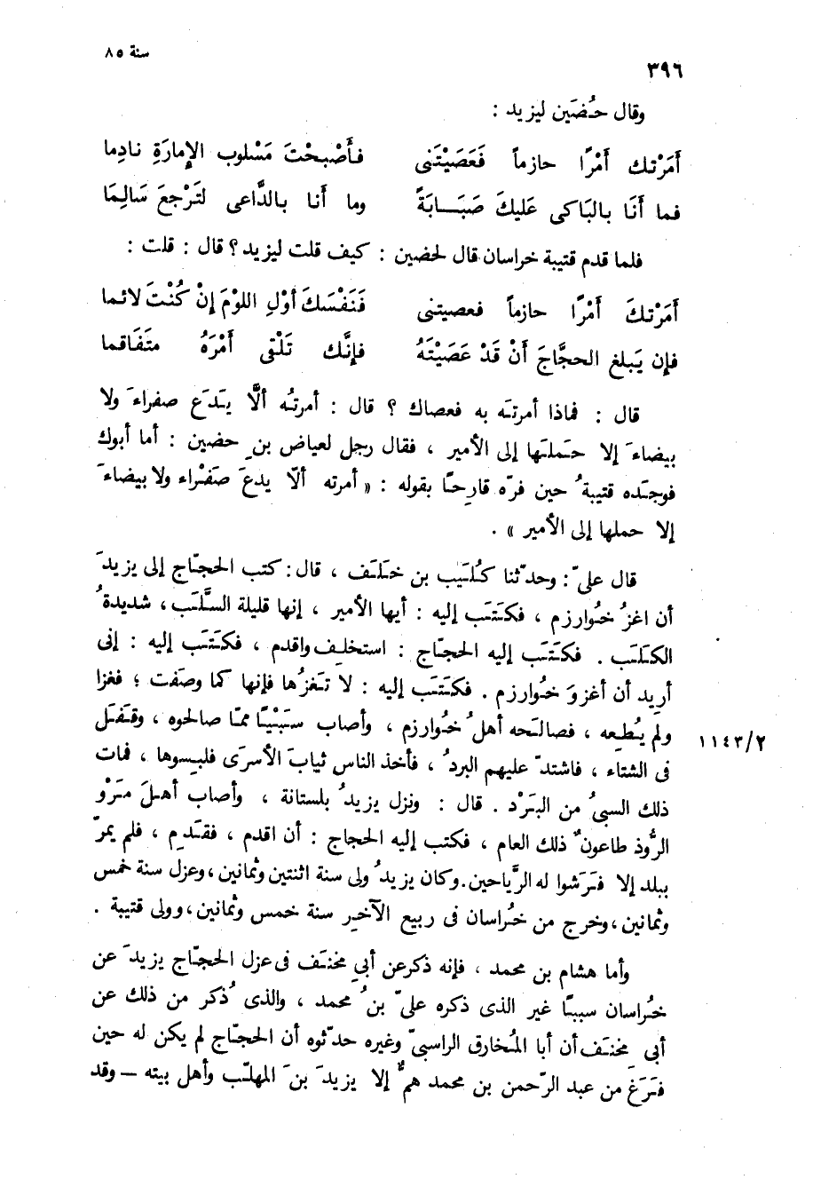 فلما قدم قتيبة خراسان قال لحضين: كيف قلت ليزيد؟ قال: قلت: