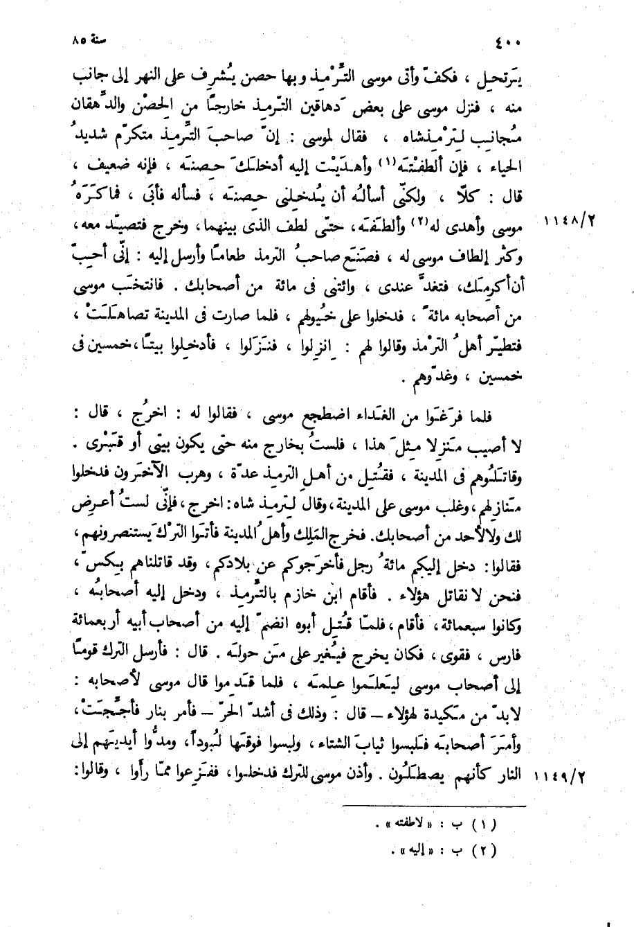 يرتحل، فكف وأتى موسى الترمذ وبها حصن يشرف على النهر إلى جانب منه، فنزل موسى على بعض دهاقين الترمذ خارجا من الحصن والدهقان مجانب لترمذ شاه، فقال لموسى: إن صاحب الترمذ متكرم شديد الحياء، فإن ألطفته وأهديت إليه أدخلك حصنه، فإنه ضعيف، قال: كلا، ولكني أسأله أن يدخلني حصنه، فسأله فأبى، فما كره موسى وأهدى له وألطفه، حتى لطف الذي بينهما، وخرج فتصيد معه، وكثر إلطاف موسى له، فصنع صاحب الترمذ طعاما وأرسل إليه: أني أحب اكرمك، فتغد عندي، وائتني في مائة من أصحابك فانتخب موسى من أصحابه مائة، فدخلوا على خيولهم، فلما صارت في المدينة تصاهلت، فتطير أهل الترمذ وقالوا لهم: انزلوا، فنزلوا، فأدخلوا بيتا، خمسين في خمسين، وغدوهم.