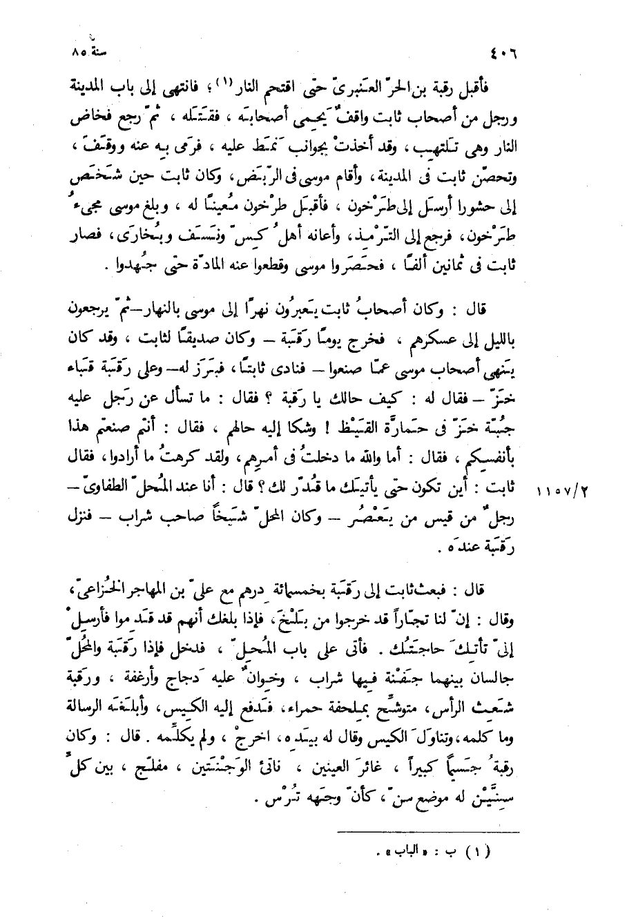 قال: وكان أصحاب ثابت يعبرون نهرا إلى موسى بالنهار- ثم يرجعون بالليل إلى عسكرهم، فخرج يوما رقبة- وكان صديقا لثابت، وقد كان ينهى أصحاب موسى عما صنعوا- فنادى ثابتا، فبرز له- وعلى رقبة قباء خز- فقال له: كيف حالك يا رقبة؟ فقال: ما تسأل عن رجل عليه جبة خز في حمارة القيظ! وشكا إليه حالهم، فقال: أنتم صنعتم هذا بأنفسكم، فقال: أما والله ما دخلت في أمرهم، ولقد كرهت ما أرادوا، فقال ثابت: أين تكون حتى يأتيك ما قدر لك؟ قال: أنا عند المحل الطفاوي- رجل من قيس من يعصر- وكان المحل شيخا صاحب شراب- فنزل رقبة عنده.