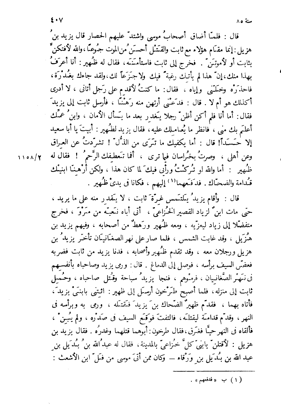 قال: وأقام يزيد يلتمس غرة ثابت، لا يقدر منه على ما يريد، حتى مات ابن لزياد القصير الخزاعي، أتى أباه نعيه من مرو، فخرج متفضلا إلى زياد ليعزيه، ومعه ظهير ورهط من أصحابه، وفيهم يزيد بن هزيل، وقد غابت الشمس، فلما صار على نهر الصغانيان تأخر يزيد بن هزيل ورجلان معه، وقد تقدم ظهير وأصحابه، فدنا يزيد من ثابت فضربه فعض السيف برأسه، فوصل إلى الدماغ قال: ورمى يزيد وصاحباه بأنفسهم في نهر الصغانيان، فرموهم، فنجا يزيد سباحة وقتل صاحباه، وحمل ثابت إلى منزله، فلما أصبح طرخون أرسل إلى ظهير: ائتني بابني يزيد، فأتاه بهما، فقدم ظهير الضحاك بن يزيد فقتله، ورمى به وبرأسه في النهر، وقدم قدامة ليقتله، فالتفت فوقع السيف في صدره، ولم يبن، فألقاه في النهر حيا فغرق، فقال طرخون: أبوهما قتلهما وغدره فقال يزيد بن هزيل: لأقتلن يا بني كل خزاعي بالمدينة، فقال له عبد الله بن بديل بن عبد الله بن بديل بن ورقاء- وكان ممن أتى موسى من فل ابن الأشعث: