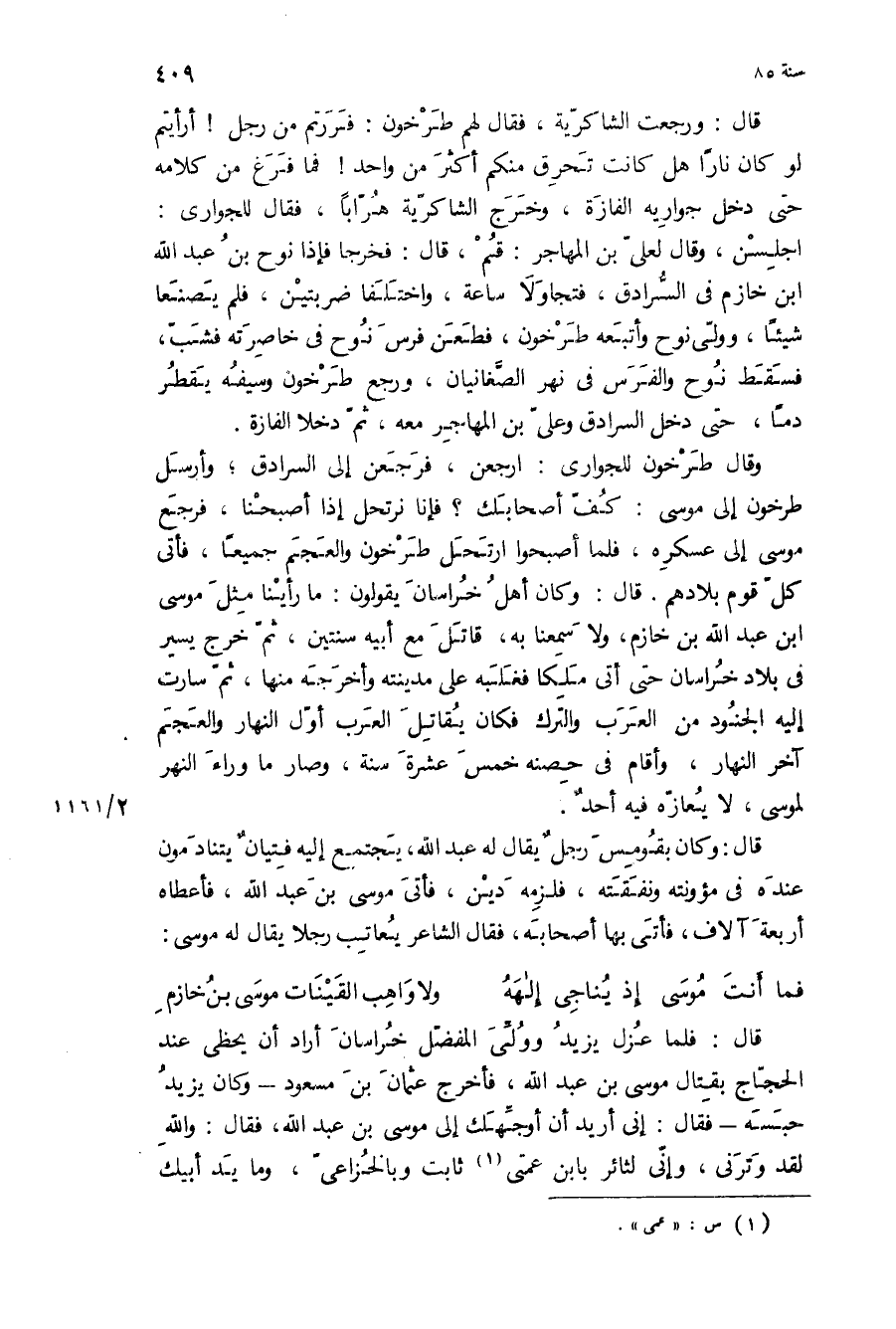 وقال طرخون للجواري: ارجعن، فرجعن إلى السرادق، وأرسل طرخون إلى موسى: كف أصحابك؟ فإنا نرتحل إذا أصبحنا، فرجع موسى إلى عسكره، فلما أصبحوا ارتحل طرخون والعجم جميعا، فأتى كل قوم بلادهم قال: وكان أهل خراسان يقولون: ما رأينا مثل موسى ابن عبد الله بن خازم، ولا سمعنا به، قاتل مع أبيه سنتين، ثم خرج يسير في بلاد خراسان حتى أتى ملكا فغلبه على مدينته وأخرجه منها، ثم سارت إليه الجنود من العرب والترك فكان يقاتل العرب أول النهار والعجم آخر النهار، وأقام في حصنه خمس عشره سنه، وصار ما وراء النهر لموسى، لا يعازه فيه أحد.