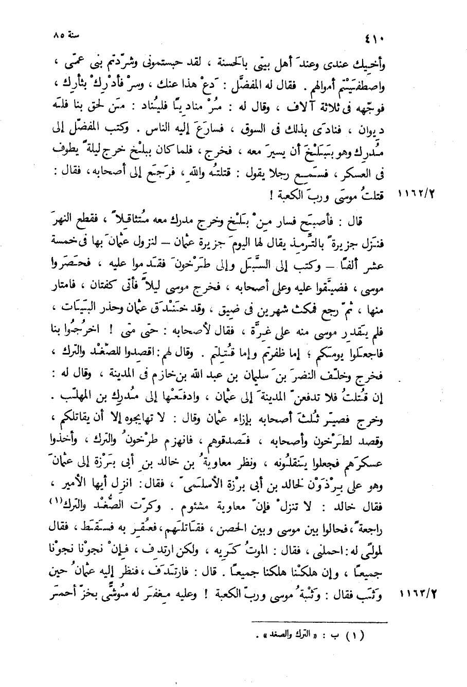 قتلت موسى ورب الكعبة! قال: فأصبح فسار من بلخ وخرج مدرك معه متثاقلا، فقطع النهر فنزل جزيرة بالترمذ يقال لها اليوم جزيرة عثمان- لنزول عثمان بها في خمسة عشر ألفا- وكتب إلى السبل وإلى طرخون فقدموا عليه، فحصروا موسى، فضيقوا عليه وعلى أصحابه، فخرج موسى ليلا فأتى كفتان، فامتار منها، ثم رجع فمكث شهرين في ضيق، وقد خندق عثمان وحذر البيات، فلم يقدر موسى منه على غرة، فقال لأصحابه: حتى متى! اخرجوا بنا فاجعلوا يومكم، إما ظفرتم وإما قتلتم وقال لهم: اقصدوا للصغد والترك، فخرج وخلف النضر بن سُلَيْمَان بن عبد الله بن خازم في المدينة، وقال له: