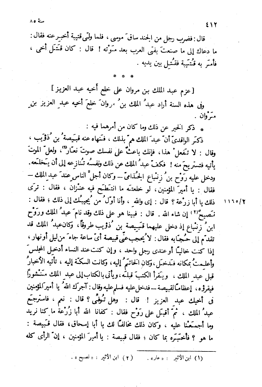 نصيح إن شاء الله قال: فبينا هو على ذلك وقد نام عبد الملك وروح ابن زنباع إذ دخل عليهما قبيصة بن ذؤيب طروقا، وكان عبد الملك قد تقدم إلى حجابه فقال: لا يجب عني قبيصة أي ساعة جاء من ليل أو نهار، إذا كنت خاليا أو عندي رجل واحد، وإن كنت عند النساء أدخل المجلس وأعلمت بمكانه فدخل، وكان الخاتم إليه، وكانت السكة إليه، تأتيه الأخبار قبل عبد الملك، ويقرأ الكتب قبله، ويأتي بالكتاب إلى عبد الملك منشورا فيقرؤه، إعظاما لقبيصة- فدخل عليه فسلم عليه وقال: أجرك الله يا أمير المؤمنين في أخيك عبد العزيز! قال: وهل توفي؟ قال: نعم، فاسترجع عبد الملك، ثم أقبل على روح فقال: كفانا الله أبا زرعة ما كنا نريد وما أجمعنا عليه، وكان ذلك مخالفا لك يا أبا إسحاق، فقال قبيصة: