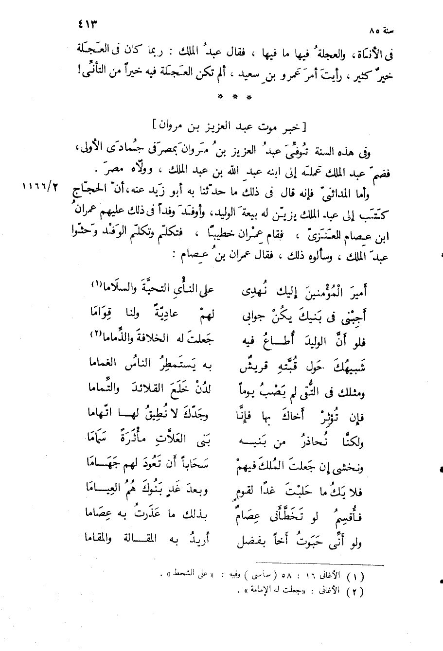 وأما المدائني فَإِنَّهُ قَالَ فِي ذَلِكَ مَا حَدَّثَنَا بِهِ أبو زيد عنه، أن الحجاج كتب إلى عبد الملك يزين له بيعة الوليد، وأوفد وفدا في ذلك عليهم عمران ابن عصام العنزي، فقام عمران خطيبا، فتكلم وتكلم الوفد وحثوا عبد الملك، وسألوه ذلك، فقال عمران بن عصام: