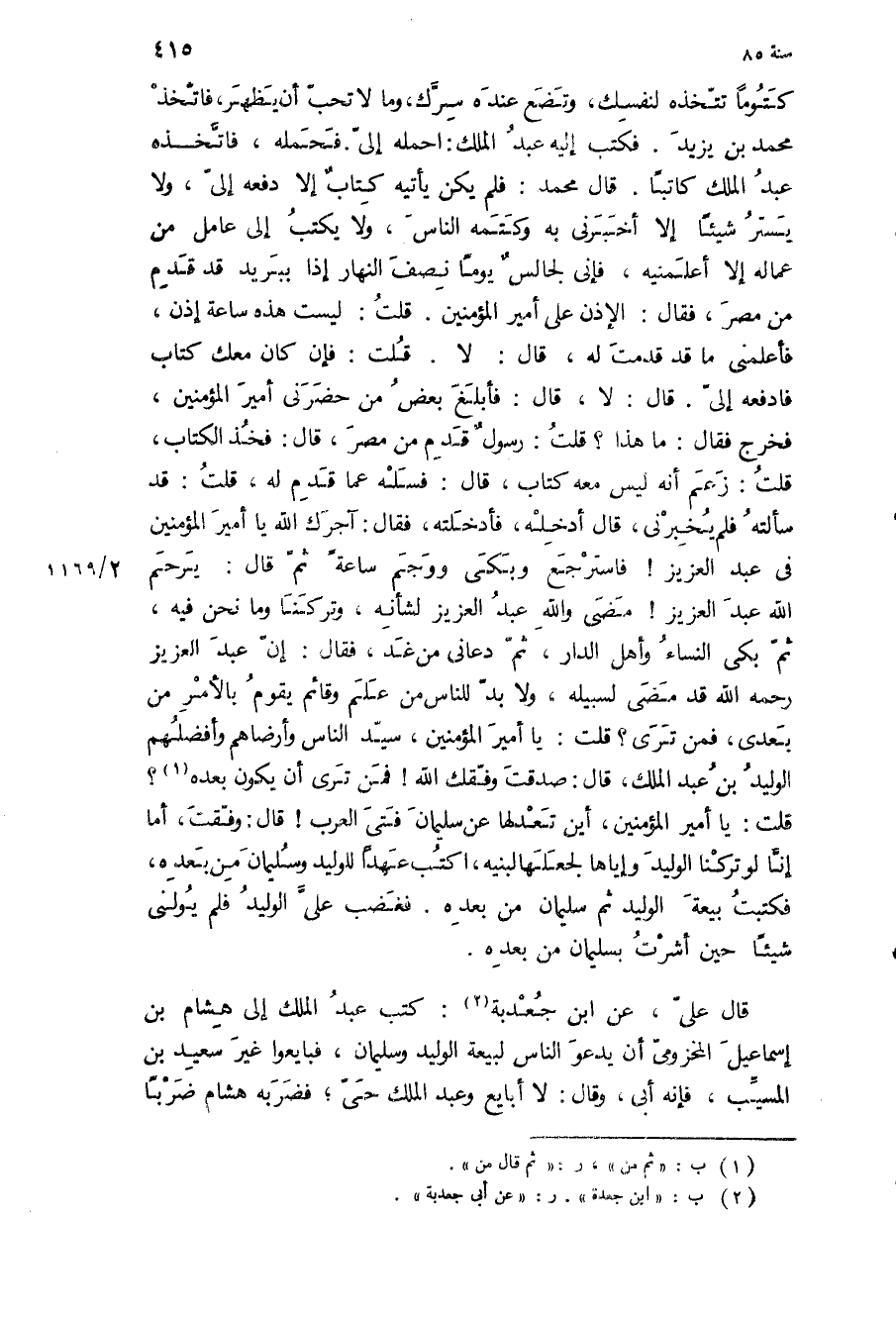 كتوما تتخذه لنفسك، وتضع عنده سرك، وما لا تحب أن يظهر، فاتخذ مُحَمَّد بن يزيد فكتب إليه عبد الملك: احمله إلي فحمله، فاتخذه عبد الملك كاتبا قال مُحَمَّد: فلم يكن يأتيه كتاب إلا دفعه إلي، ولا يستر شيئا إلا أخبرني به وكتمه الناس، ولا يكتب إلى عامل من عماله إلا أعلمنيه، فإني لجالس يوما نصف النهار إذا ببريد قد قدم من مصر، فقال: الإذن على أمير المؤمنين قلت: ليست هذه ساعة اذن، فأعلمني ما قد قدمت له، قال: لا قلت: فإن كان معك كتاب فادفعه إلي قال: لا، قال: فأبلغ بعض من حضرني أمير المؤمنين، فخرج فقال: ما هذا؟ قلت: رسول قدم من مصر، قال: فخذ الكتاب، قلت: زعم أنه ليس معه كتاب، قال: فسله عما قدم له، قلت: قد سألته فلم يخبرني، قال أدخله، فأدخلته، فقال: أجرك الله يا أمير المؤمنين في عبد العزيز! فاسترجع وبكى ووجم ساعة ثم قال: يرحم الله عبد العزيز! مضى والله عبد العزيز لشأنه، وتركنا وما نحن فيه، ثم بكى النساء وأهل الدار، ثم دعاني من غد، فقال: إن عبد العزيز رحمه الله قد مضى لسبيله، ولا بد للناس من علم وقائم يقوم بالأمر من بعدي، فمن ترى؟ قلت: يا أمير المؤمنين، سيد الناس وأرضاهم وأفضلهم الوليد بن عبد الملك، قال: صدقت وفقك الله! فمن ترى أن يكون بعده؟