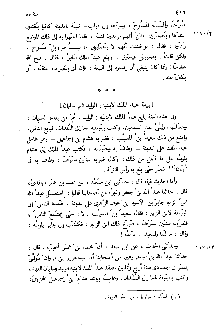 وفي هذه السنة بايع عبد الملك لابنيه: الوليد، ثم من بعده لسُلَيْمَان، وجعلهما وليي عهد المسلمين، وكتب ببيعته لهما إلى البلدان، فبايع الناس، وامتنع من ذلك سعيد بن المسيب، فضربه هشام بن إسماعيل- وهو عامل عبد الملك على المدينة- وطاف به وحبسه، فكتب عبد الملك إلى هشام يلومه على ما فعل من ذلك، وكان ضربه ستين سوطا، وطاف به في تبان شعر حتى بلغ به رأس الثنية.