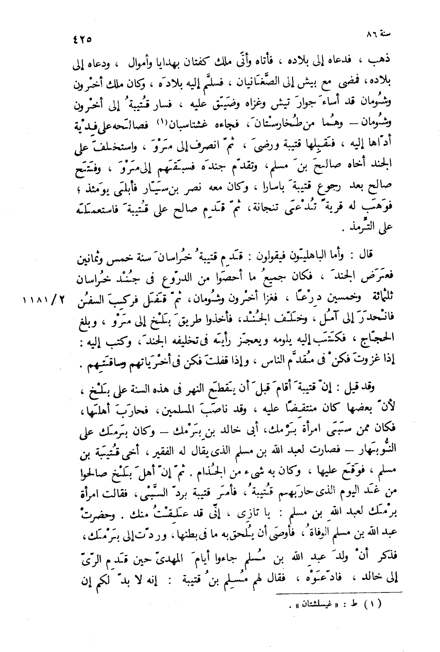 ذهب، فدعاه إلى بلاده، فأتاه وأتى ملك كفتان بهدايا وأموال، ودعاه إلى بلاده، فمضى مع بيش إلى الصغانيان، فسلم إليه بلاده، وكان ملك أخرون وشومان قد أساء جوار تيش وغزاه وضيق عليه، فسار قتيبة إلى أخرون وشومان- وهما من طخارستان، فجاءه غشتاسبان فصالحه على فدية أداها إليه، فقبلها قتيبة ورضي، ثم انصرف إلى مرو، واستخلف على الجند أخاه صالح بن مسلم، وتقدم جنده فسبقهم إلى مرو، وفتح صالح بعد رجوع قتيبة باسارا، وكان معه نصر بن سيار فأبلى يومئذ، فوهب له قرية تدعى تنجانة، ثم قدم صالح على قتيبة فاستعمله على الترمذ.