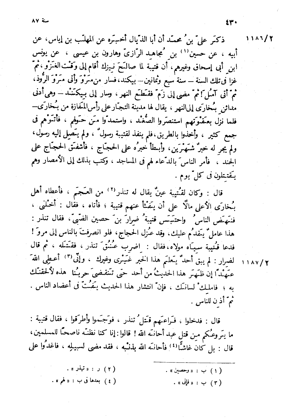 قال: وكان لقتيبة عين يقال له تنذر من العجم، فأعطاه أهل بخارى الأعلى مالا على أن يفثأ عنهم قتيبة، فأتاه، فقال: أخلني، فنهض الناس واحتبس قتيبة ضرار بن حصين الضبي، فقال تنذر: