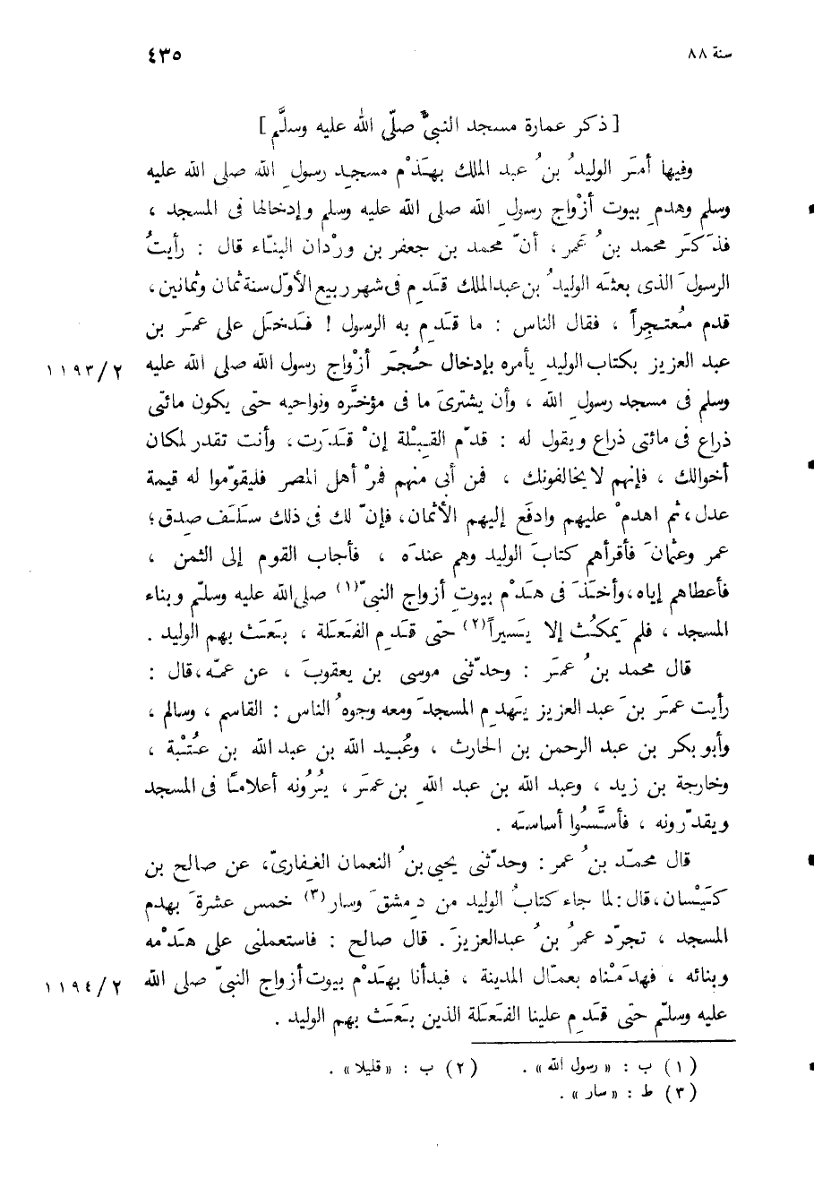 وفيها أمر الوليد بن عبد الملك بهدم مسجد رسول الله ص وهدم بيوت ازواج رسول الله ص وإدخالها في المسجد، فذكر مُحَمَّد بن عمر، أن مُحَمَّد بن جعفر بن وردان البناء قال: رأيت الرسول الذي بعثه الوليد بن عبد الملك قدم في شهر ربيع الأول سنة ثمان وثمانين، قدم معتجرا، فقال الناس: ما قدم به الرسول! فدخل على عمر بن عبد العزيز بكتاب الوليد يأمره بإدخال حجر ازواج رسول الله ص في مسجد رسول الله، وأن يشتري ما في مؤخره ونواحيه حتى يكون مائتي ذراع في مائتي ذراع ويقول له: قدم القبلة إن قدرت، وأنت تقدر لمكان أخوالك، فإنهم لا يخالفونك، فمن أبى منهم فمر أهل المصر فليقوموا له قيمة عدل، ثم اهدم عليهم وادفع إليهم الأثمان، فإن لك في ذلك سلف صدق، عمر وعثمان فأقرأهم كتاب الوليد وهم عنده، فأجاب القوم إلى الثمن، فأعطاهم إياه، وأخذ في هدم بيوت أزواج النبي ص وبناء المسجد، فلم يمكث إلا يسيرا حتى قدم الفعلة، بعث بهم الوليد.