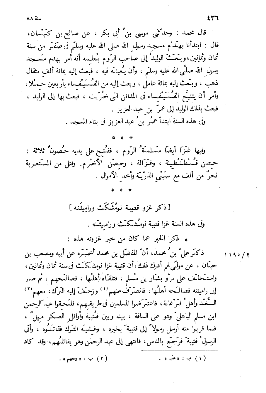 قال مُحَمَّد: وحدثني موسى بن أبي بكر، عن صالح بن كيسان، قال: ابتدأنا بهدم مسجد رسول الله ص في صفر من سنة ثمان وثمانين، وبعث الوليد إلى صاحب الروم يعلمه أنه أمر بهدم مسجد رسول الله ص، وأن يعينه فيه، فبعث إليه بمائة ألف مثقال ذهب، وبعث إليه بمائة عامل، وبعث إليه من الفسيفساء بأربعين حملا، وأمر أن يتتبع الفسيفساء في المدائن التي خربت، فبعث بها إلى الوليد، فبعث بذلك الوليد إلى عمر بن عبد العزيز.