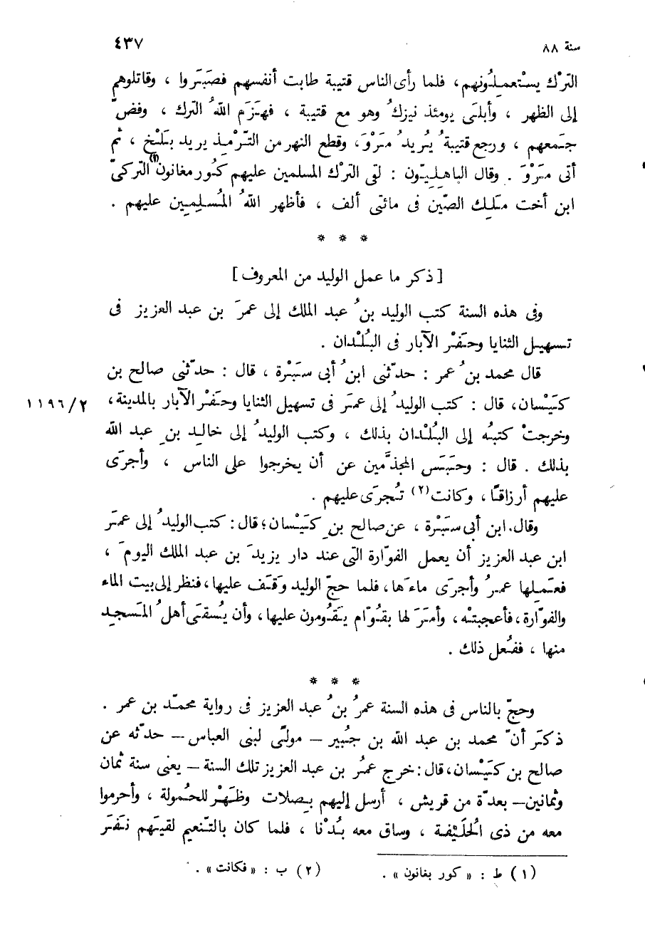 وفي هذه السنة كتب الوليد بن عبد الملك إلى عمر بن عبد العزيز في تسهيل الثنايا وحفر الآبار في البلدان.