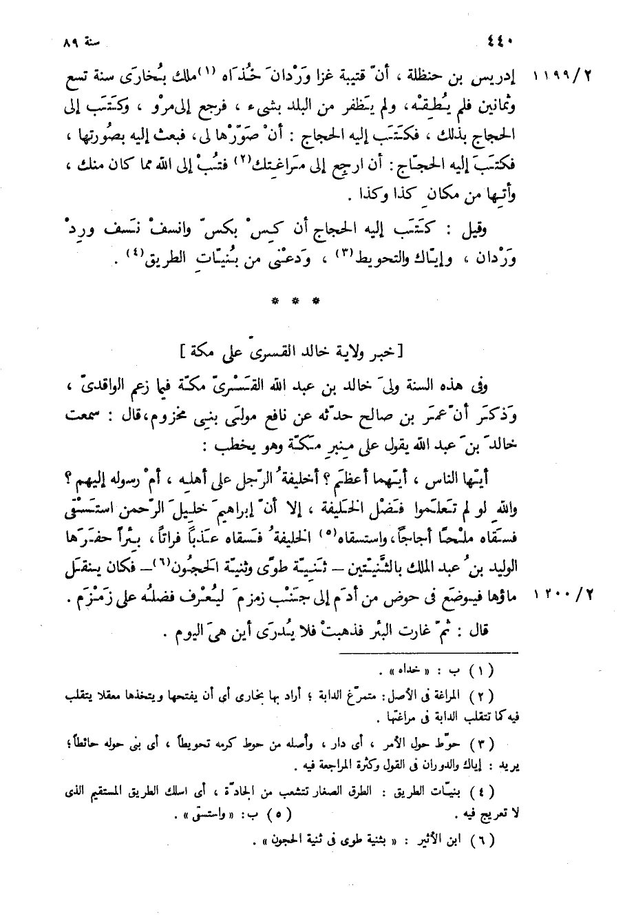 وفي هذه السنة ولي خالد بن عبد الله القسري مكة فيما زعم الواقدي، وذكر أن عمر بن صالح حدثه عن نافع مولى بني مخزوم، قال: سمعت خالد بن عبد الله يقول على منبر مكة وهو يخطب: