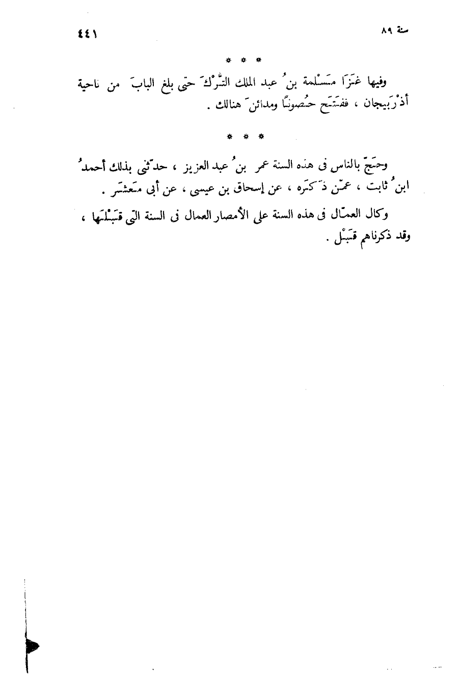 وفيها غزا مسلمة بن عبد الملك الترك حتى بلغ الباب من ناحية أذربيجان، ففتح حصونا ومدائن هنالك.
