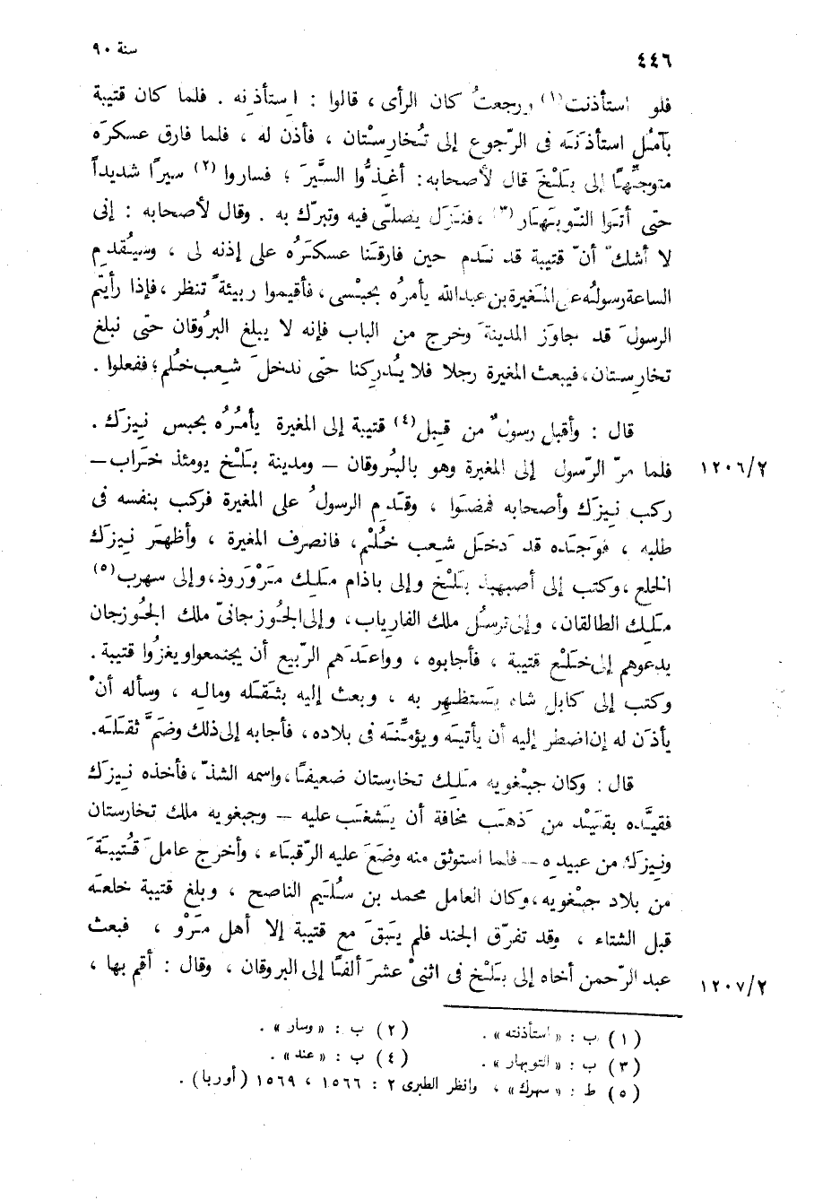 وماله، وسأله أن يأذن له إن اضطر إليه أن يأتيه ويؤمنه في بلاده، فأجابه إلى ذلك وضم ثقله قال: وكان جبغويه ملك تخارستان ضعيفا، واسمه الشذ، فأخذه نيزك فقيده بقيد من ذهب مخافه ان يشغب عليه- وجبغويه ملك تخارستان ونيزك من عبيده- فلما استوثق منه وضع عليه الرقباء، وأخرج عامل قتيبة من بلاد جبغويه، وكان العامل مُحَمَّد بن سليم الناصح، وبلغ قتيبة خلعه قبل الشتاء، وقد تفرق الجند فلم يبق مع قتيبة إلا أهل مرو، فبعث عبد الرحمن أخاه إلى بلخ في اثني عشر ألفا إلى البروقان، وقال: أقم بها،