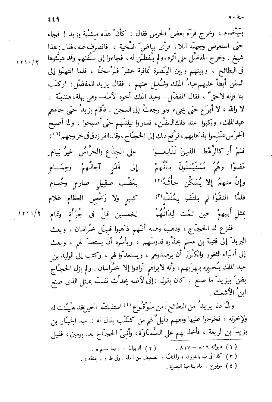 بيضاء، وخرج فرآه بعض الحرس فقال: كأن هذه مشية يزيد! فجاء حتى استعرض وجهه ليلا، فرأى بياض اللحية، فانصرف عنه، فقال: هذا شيخ وخرج المفضل على أثره، ولم يفطن له، فجاءوا إلى سفنهم وقد هيئوها في البطائح، وبينهم وبين البصرة ثمانية عشر فرسخا، فلما انتهوا إلى السفن أبطأ عليهم عبد الملك وشغل عنهم، فقال يزيد للمفضل: اركب بنا فإنه لاحق، فقال المفضل- وعبد الملك أخوه لأمه- وهي بهلة، هندية: