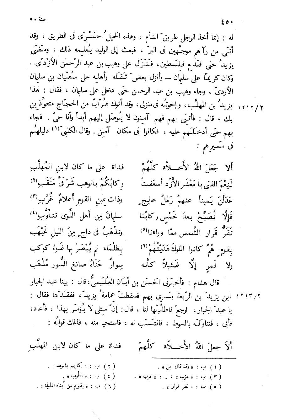 له: إنما أخذ الرجل طريق الشام، وهذه الخيل حسرى في الطريق، وقد أتى من رآهم موجهين في البر، فبعث إلى الوليد يعلمه ذلك، ومضى يزيد حتى قدم فلسطين، فنزل على وهيب بن عبد الرحمن الأزدي- وكان كريما على سُلَيْمَان- وأنزل بعض ثقله وأهله على سفيان بن سُلَيْمَان الأزدي، وجاء وهيب بن عبد الرحمن حتى دخل على سُلَيْمَان، فقال: هذا يزيد بن المهلب، وإخوته في منزلي، وقد أتوك هرابا من الحجاج متعوذين بك، قال: فأتني بهم فهم آمنون لا يوصل إليهم أبدا وأنا حي فجاء بهم حتى أدخلهم عليه، فكانوا في مكان آمن، وقال الكلبي دليلهم في مسيرهم: