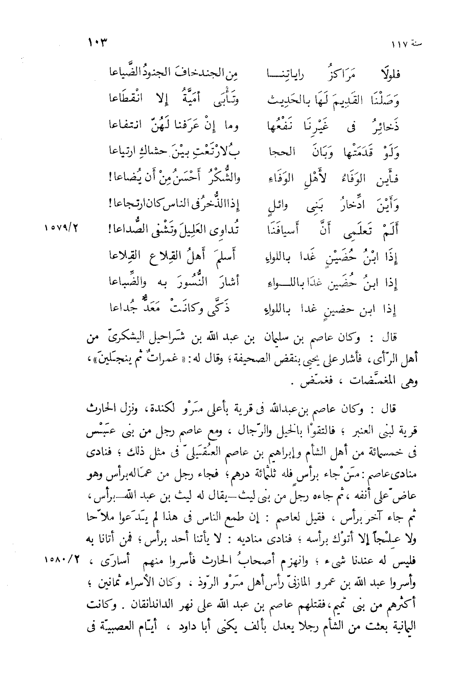 قَالَ: وكان عاصم بْن عبد الله في قرية بأعلى مرو لكندة، ونزل الحارث قرية لبني العنبر، فالتقوا بالخيل والرجال، ومع عاصم رجل من بنى عبس في خمسمائة من أهل الشام وإبراهيم بْن عاصم العقيلي في مثل ذلك، فنادى منادي عاصم: من جاء برأس فله ثلاثمائة درهم، فجاء رجل من عماله برأس وهو عاض على أنفه، ثم جاءه رجل من بني ليث- يقال له ليث بْن عبد الله- برأس، ثم جاء آخر برأس، فقيل لعاصم: إن طمع الناس في هذا لم يدعوا ملاحا ولا علجا إلا أتوك برأسه، فنادى مناديه: لا يأتنا أحد برأس، فمن أتانا به فليس له عندنا شيء، وانهزم أصحاب الحارث فأسروا منهم أسارى، وأسروا عبد الله بْن عمرو المازني رأس أهل مرو الروذ، وكان الأسراء ثمانين، أكثرهم من بني تميم، فقتلهم عاصم بْن عبد الله على نهر الداندنقان وكانت اليمانية بعثت من الشام رجلا يعدل بألف يكنى أبا داود، أيام العصبية في