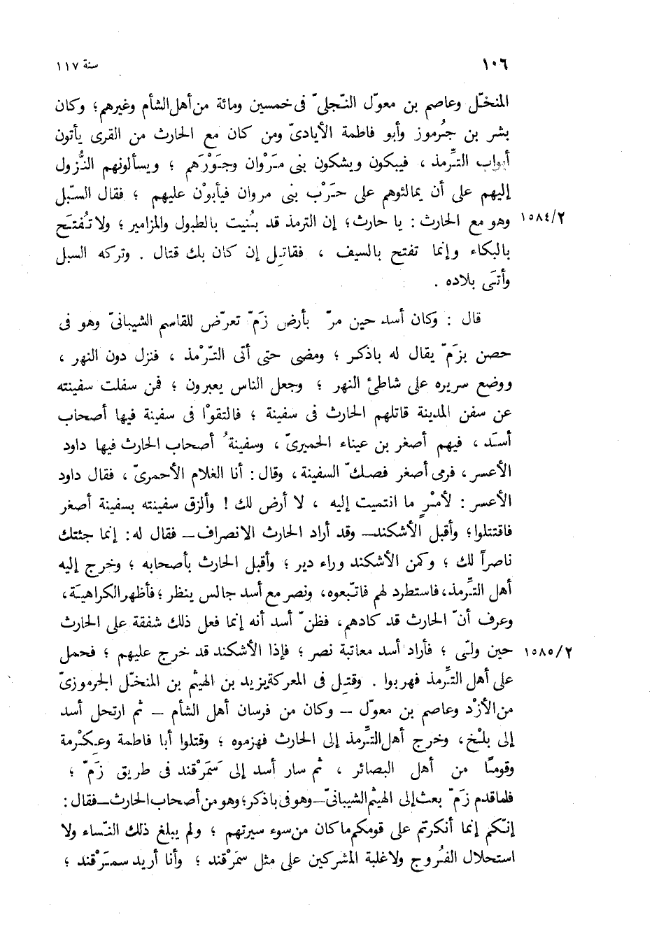قَالَ: وكان أسد حين مر بأرض زم تعرض للقاسم الشيباني وهو في حصن بزم يقال له باذكر، ومضى حتى أتى الترمذ، فنزل دون النهر، ووضع سريره على شاطئ النهر، وجعل الناس يعبرون، فمن سفلت سفينته عن سفن المدينة قاتلهم الحارث في سفينة، فالتقوا في سفينة فيها أصحاب أسد، فيهم أصغر بْن عيناء الحميري، وسفينة أصحاب الحارث فيها داود الأعسر، فرمى أصغر فصك السفينة، وقال: أنا الغلام الأحمري، فقال داود الأعسر: لأمر ما انتميت إليه، لا أرض لك! وألزق سفينته بسفينة أصغر فاقتتلوا، وأقبل الأشكند- وقد أراد الحارث الانصراف- فقال له: إنما جئتك ناصرا لك، وكمن الأشكند وراء دير، وأقبل الحارث بأصحابه، وخرج إليه أهل الترمذ فاستطرد لهم فاتبعوه، ونصر مع أسد جالس ينظر، فأظهر الكراهية، وعرف أن الحارث قد كادهم، فظن أسد أنه إنما فعل ذلك شفقة على الحارث حين ولى، فأراد أسد معاتبة نصر، فإذا الأشكند قد خرج عليهم، فحمل على أهل الترمذ فهربوا وقتل في المعركة يزيد بْن الهيثم بْن المنخل الجرموزي من الأزد وعاصم بْن معول- وكان من فرسان أهل الشام- ثم ارتحل أسد إلى بلخ، وخرج أهل الترمذ إلى الحارث فهزموه، وقتلوا أبا فاطمة وعكرمة وقوما من أهل البصائر، ثم سار أسد الى سمرقند في طريق زم، فما قدم زم بعث إلى الهيثم الشيباني- وهو في باذكر، وهو من أصحاب الحارث- فقال: