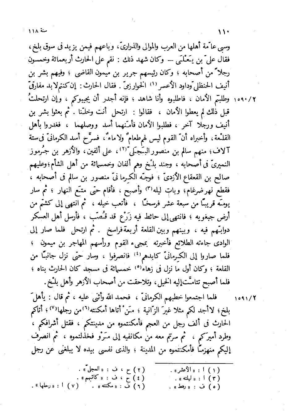 وسبى عامة أهلها من العرب والموالي والذراري، وباعهم فيمن يزيد في سوق بلخ، فقال علي بْن يعلى- وكان شهد ذلك: نقم على الحارث أربعمائة وخمسون رجلا من أصحابه، وكان رئيسهم جرير بْن ميمون القاضي، وفيهم بشر بْن أنيف الحنظلي وداود الأعسر الخوارزمي فقال الحارث: إن كنتم لا بد مفارقي وطلبتم الأمان، فاطلبوه وأنا شاهد، فإنه أجدر أن يجيبوكم، وإن ارتحلت قبل ذلك لم يعطوا الأمان، فقالوا: ارتحل أنت وخلنا ثم بعثوا بشر بْن أنيف ورجلا آخر، فطلبوا الأمان فآمنهما أسد ووصلهما، فغدروا بأهل القلعة، وأخبراه أن القوم ليس لهم طعام ولا ماء، فسرح أسد الكرماني في ستة آلاف، منهم سالم بْن منصور البجلي، على ألفين، والأزهر بْن جرموز النميري في اصحابه، وجند بلخ وهم الفان وخمسمائة من اهل الشام، وعليهم صالح بْن القعقاع الأزدي، فوجه الكرماني منصور بْن سالم في أصحابه، فقطع نهر ضرغام، وبات ليله وأصبح، فأقام حتى متع النهار، ثم سار يومه قريبا من سبعة عشر فرسخا، فأتعب خيله، ثم انتهى إلى كشتم من ارض جبغويه، فانتهى إلى حائط فيه زرع قد قصب، فأرسل أهل العسكر دوابهم فيه، وبينهم وبين القلعة أربع فراسخ ثم ارتحل فلما صار إلى الوادي جاءته الطلائع فأخبرته بمجيء القوم ورأسهم المهاجر بْن ميمون، فلما صاروا إلى الكرماني كابدهم فانصرفوا، وسار حتى نزل جانبا من القلعة، وكان أول ما نزل في زهاء خمسمائة في مسجد كان الحارث بناه، فلما أصبح تتامت إليه الخيل، وتلاحقت من أصحاب الأزهر وأهل بلخ.