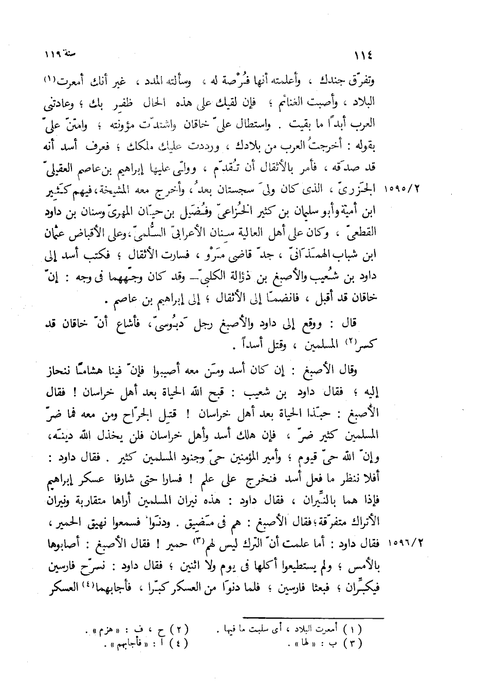 وتفرق جندك، وأعلمته أنها فرصة له، وسألته المدد، غير أنك أمعرت البلاد، وأصبت الغنائم، فإن لقيك على هذه الحال ظفر بك، وعادتني العرب أبدا ما بقيت واستطال علي خاقان واشتدت مؤونته، وامتن علي بقوله: أخرجت العرب من بلادك، ورددت عليك ملكك، فعرف أسد أنه قد صدقه، فأمر بالأثقال أن تقدم، وولى عليها إبراهيم بْن عاصم العقيلي الجزري، الذي كان ولي سجستان بعد، وأخرج معه المشيخة، فيهم كثير ابن أمية، أبو سليمان بْن كثير الخزاعي وفضيل بْن حيان المهري وسنان بْن داود القطعي، وكان على أهل العالية سنان الأعرابي السلمي، وعلى الاقباض عثمان ابن شباب الهمذاني، جد قاضي مرو، فسارت الأثقال، فكتب أسد إلى داود بْن شعيب والأصبغ بن ذؤاله الكلبي- وقد كان وجههما في وجه: إن خاقان قد أقبل، فانضما إلى الأثقال، إلى إبراهيم بْن عاصم.