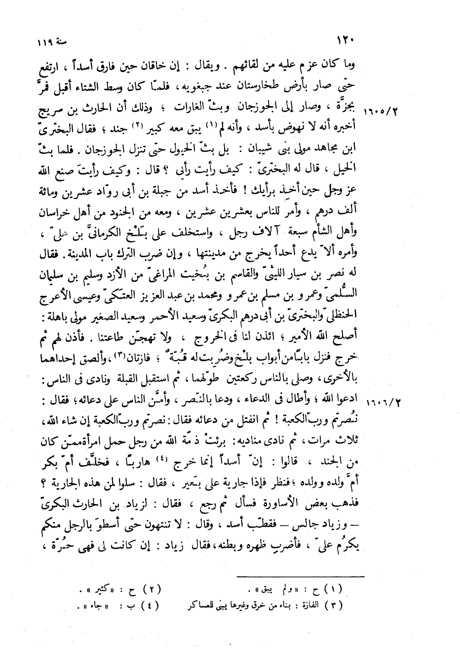 وما كان عزم عليه من لقائهم ويقال: إن خاقان حين فارق أسدا، ارتفع حتى صار بأرض طخارستان عند جبغويه، فلما كان وسط الشتاء أقبل فمر بجزة، وصار إلى الجوزجان وبث الغارات، وذلك أن الحارث بْن سريج أخبره أنه لا نهوض بأسد، وأنه لم يبق معه كبير جند، فقال البختري ابن مجاهد مولى بني شيبان: بل بث الخيول حتى تنزل الجوزجان فلما بث الخيل، قَالَ له البختري: كيف رأيت رأيي؟ قَالَ: وكيف رأيت صنع الله عز وجل حين أخذ برأيك! فأخذ أسد من جبلة بْن أبي رواد عشرين ومائة ألف درهم، وأمر للناس بعشرين عشرين، ومعه من الجنود من أهل خراسان وأهل الشام سبعة آلاف رجل، واستخلف على بلخ الكرماني بْن علي، وأمره ألا يدع أحدا يخرج من مدينتها، وإن ضرب الترك باب المدينة فقال له نصر بْن سيار الليثي والقاسم بْن بخيت المراغي من الأزد وسليم بْن سليمان السلمي وعمرو بْن مسلم بْن عمرو ومحمد بْن عبد العزيز العتكي وعيسى الأعرج الحنظلي والبختري بْن أبي درهم البكري وسعيد الأحمر وسعيد الصغير مولى باهلة: