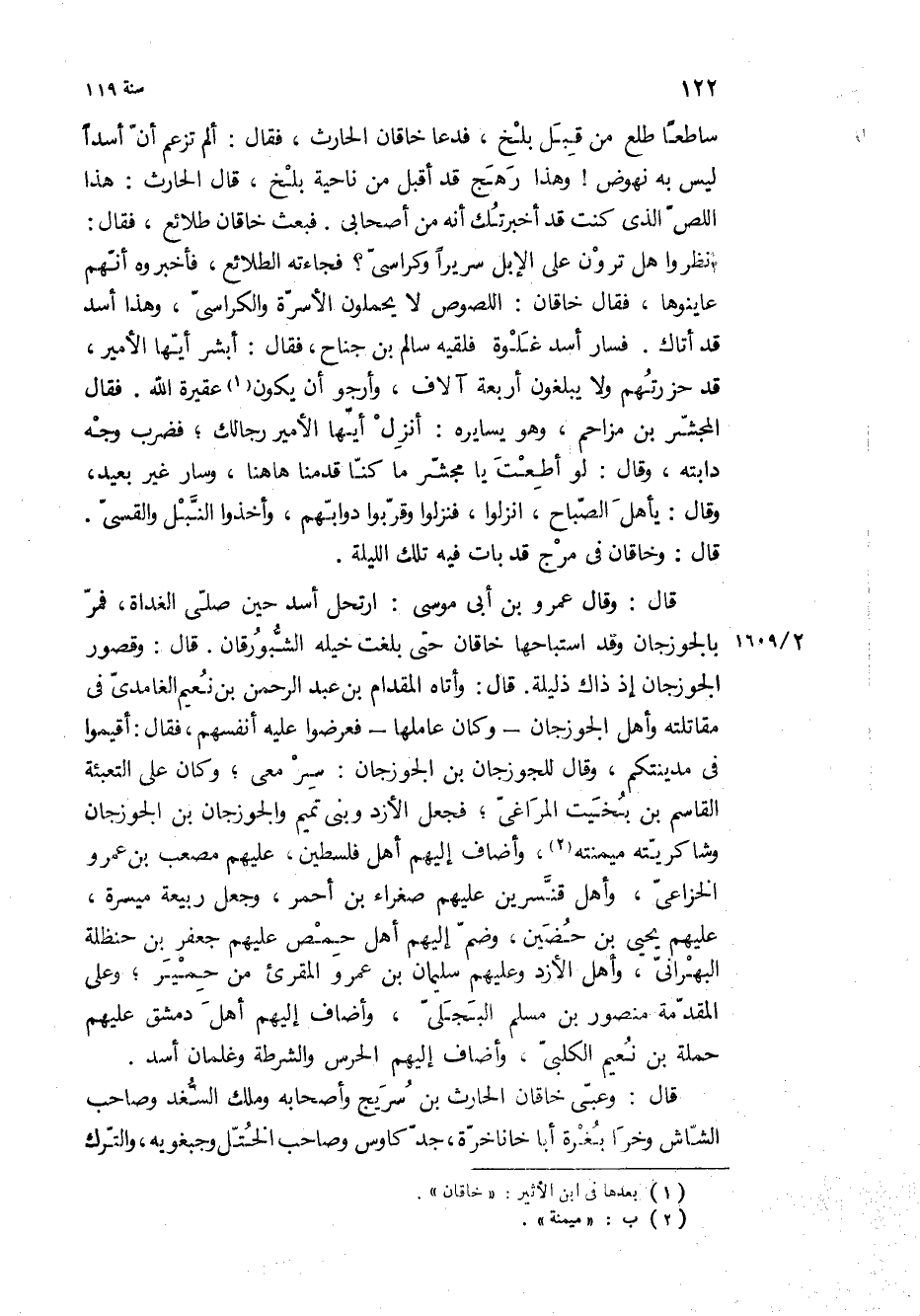قَالَ: وقال عمرو بْن أبي موسى: ارتحل أسد حين صلى الغداة، فمر بالجوزجان وقد استباحها خاقان حتى بلغت خيله الشبورقان قَالَ: وقصور الجوزجان إذ ذاك ذليلة قَالَ: وأتاه المقدام بْن عبد الرحمن بْن نعيم الغامدي في مقاتلته وأهل الجوزجان- وكان عاملها- فعرضوا عليه أنفسهم، فقال: أقيموا في مدينتكم، وقال للجوزجان بْن الجوزجان: سر معي، وكان على التعبئه القاسم بن بخيت المراغي، فجعل الأزد وبني تميم والجوزجان بْن الجوزجان وشاكريته ميمنته، وأضاف إليهم أهل فلسطين، عليهم مصعب بْن عمرو الخزاعي، وأهل قنسرين عليهم صغراء بْن أحمر، وجعل ربيعة ميسرة، عليهم يحيى بْن حضين، وضم إليهم أهل حمص عليهم جعفر بن حنظلة البهراني، وأهل الأزد وعليهم سليمان بن عمرو المقرئ من حمير، وعلى المقدمة منصور بْن مسلم البجلي، وأضاف إليهم أهل دمشق عليهم حملة بْن نعيم الكلبي، وأضاف إليهم الحرس والشرطة وغلمان أسد.