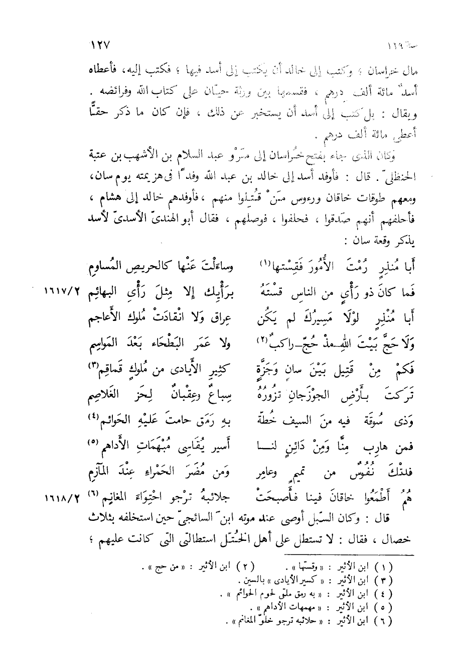 وكان الذي جاء بفتح خراسان إلى مرو عبد السلام بْن الأشهب بْن عتبة الحنظلي قَالَ: فأوفد أسد إلى خالد بْن عبد الله وفدا في هزيمته يوم سان، ومعهم طوقات خاقان ورءوس من قتلوا منهم، فأوفدهم خالد إلى هشام، فأحلفهم أنهم صدقوا، فحلفوا، فوصلهم، فقال أبو الهندي الأسدي لأسد يذكر وقعة سان: