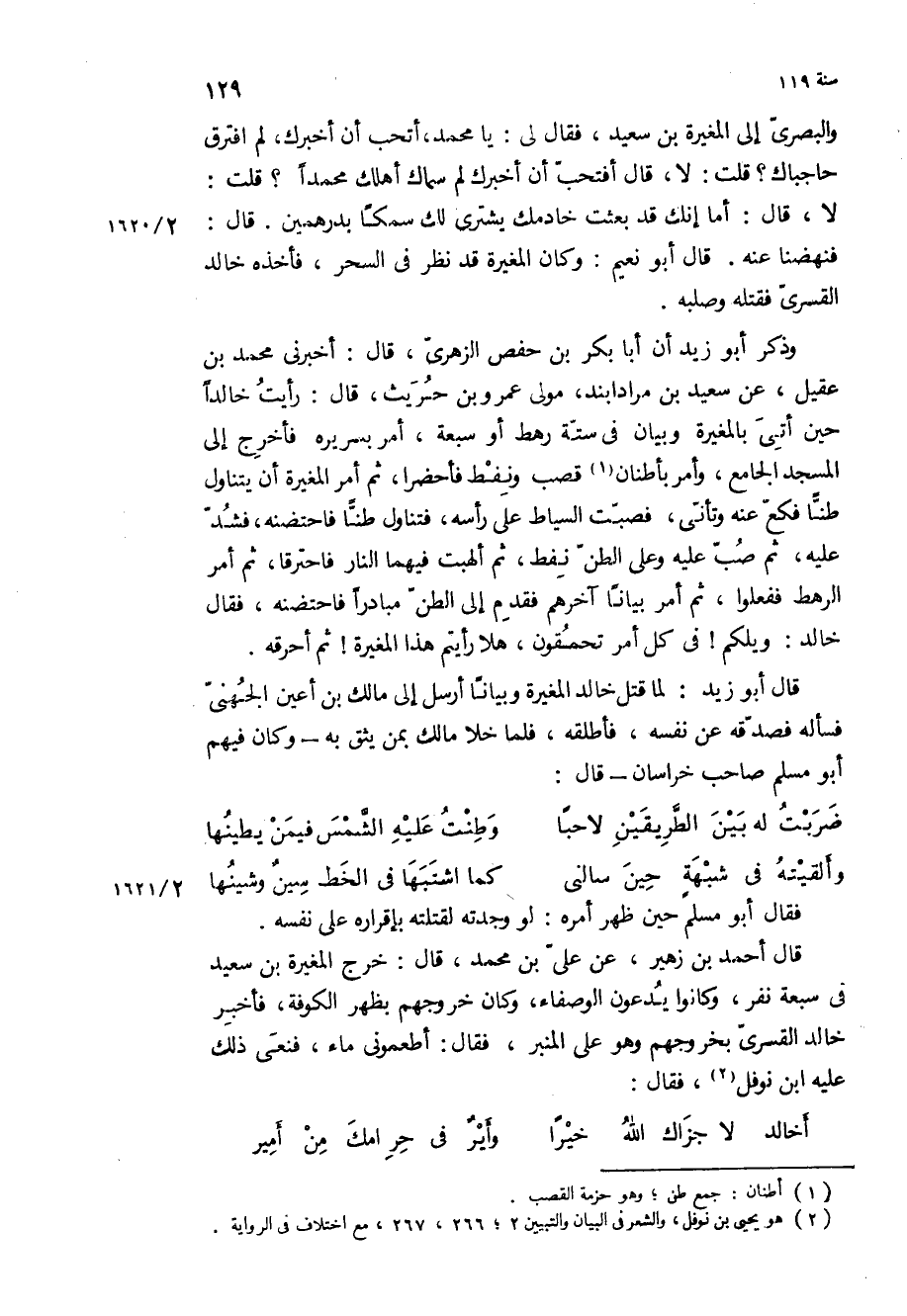 قَالَ أحمد بْن زهير، عن علي بْن محمد، قَالَ: خرج المغيرة بْن سعيد في سبعة نفر، وكانوا يدعون الوصفاء، وكان خروجهم بظهر الكوفة، فأخبر خالد القسري بخروجهم وهو على المنبر، فقال: أطعموني ماء، فنعى ذلك عليه ابن نوفل، فقال: