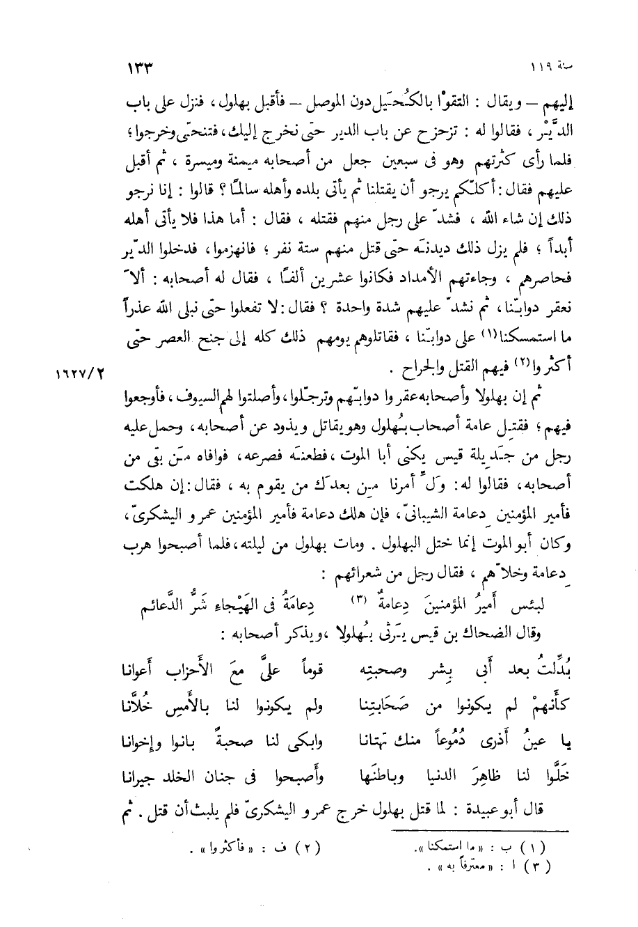 إليهم- ويقال: التقوا بالكحيل دون الموصل- فأقبل بهلول، فنزل على باب الدير، فقالوا له: تزحزح عن باب الدير حتى نخرج إليك، فتنحى وخرجوا، فلما رأى كثرتهم وهو في سبعين جعل من أصحابه ميمنة وميسرة، ثم أقبل عليهم فقال: أكلكم يرجو أن يقتلنا ثم يأتي بلده وأهله سالما؟ قالوا: إنا نرجو ذلك إن شاء الله، فشد على رجل منهم فقتله، فقال: أما هذا فلا يأتي أهله أبدا، فلم يزل ذلك ديدنه حتى قتل منهم ستة نفر، فانهزموا، فدخلوا الدير فحاصرهم، وجاءتهم الأمداد فكانوا عشرين ألفا، فقال له أصحابه: ألا نعقر دوابنا، ثم نشد عليهم شدة واحدة؟ فقال: لا تفعلوا حتى نبلي الله عذرا ما استمسكنا على دوابنا، فقاتلوهم يومهم ذلك كله إلى جنح العصر حتى أكثروا فيهم القتل والجراح.