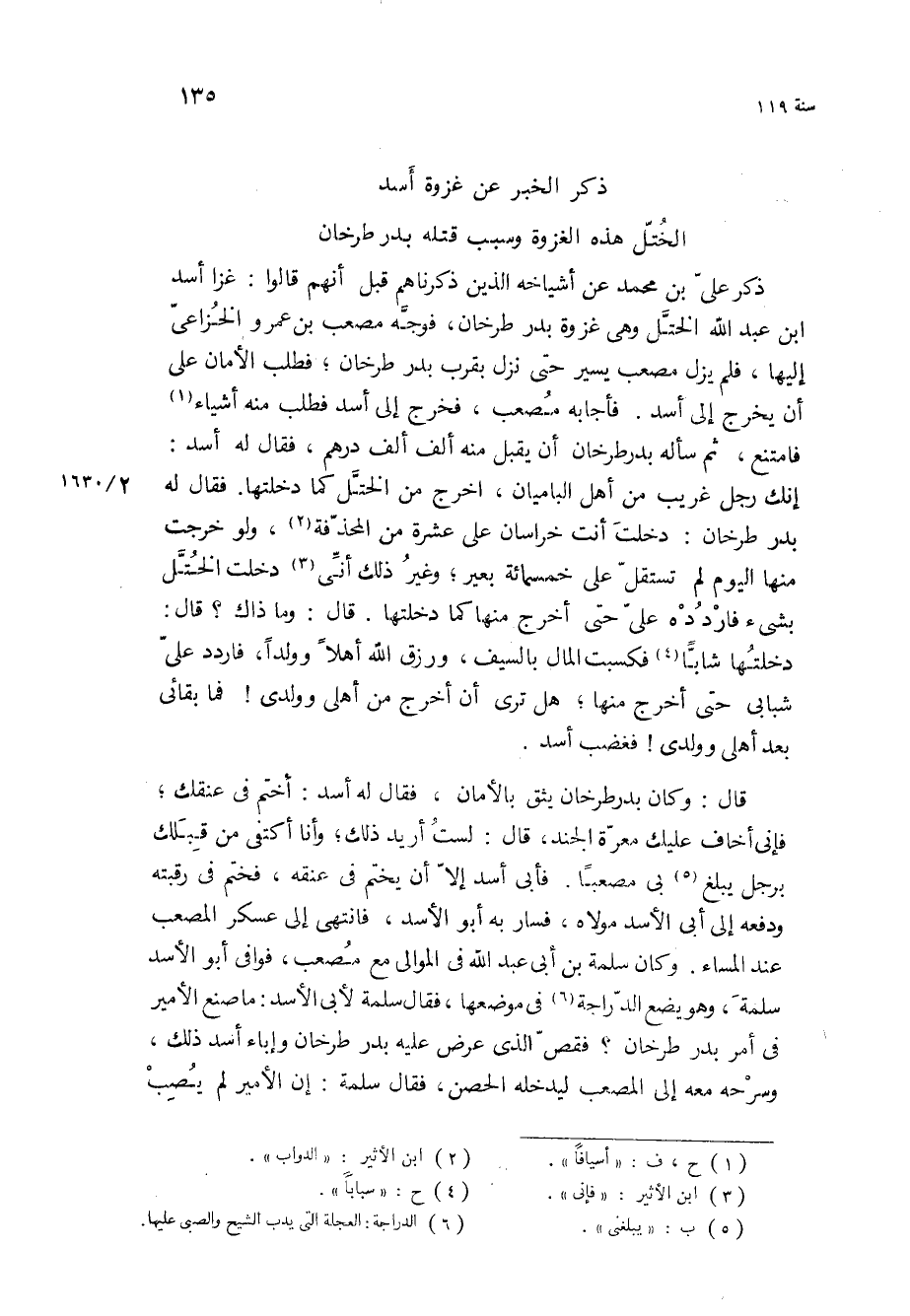 قَالَ: وكان بدر طرخان يثق بالأمان، فقال له أسد: اختم في عنقك، فإني أخاف عليك معرة الجند، قَالَ: لست أريد ذلك، وأنا أكتفي من قبلك برجل يبلغ بي مصعبا فأبى أسد إلا أن يختم في عنقه، فختم في رقبته ودفعه إلى أبي الأسد مولاه، فسار به أبو الأسد، فانتهى إلى عسكر المصعب عند المساء وكان سلمة بْن أبي عبد الله في الموالي مع مصعب، فوافى أبو الأسد سلمة، وهو يضع الدراجة في موضعها، فقال سلمة لأبي الأسد: ما صنع الأمير في امر بدر طرخان؟ فقص الذى عرض عليه بدر طرخان وإباء أسد ذلك، وسرحه معه إلى المصعب ليدخله الحصن، فقال سلمة: إن الأمير لم يصب
