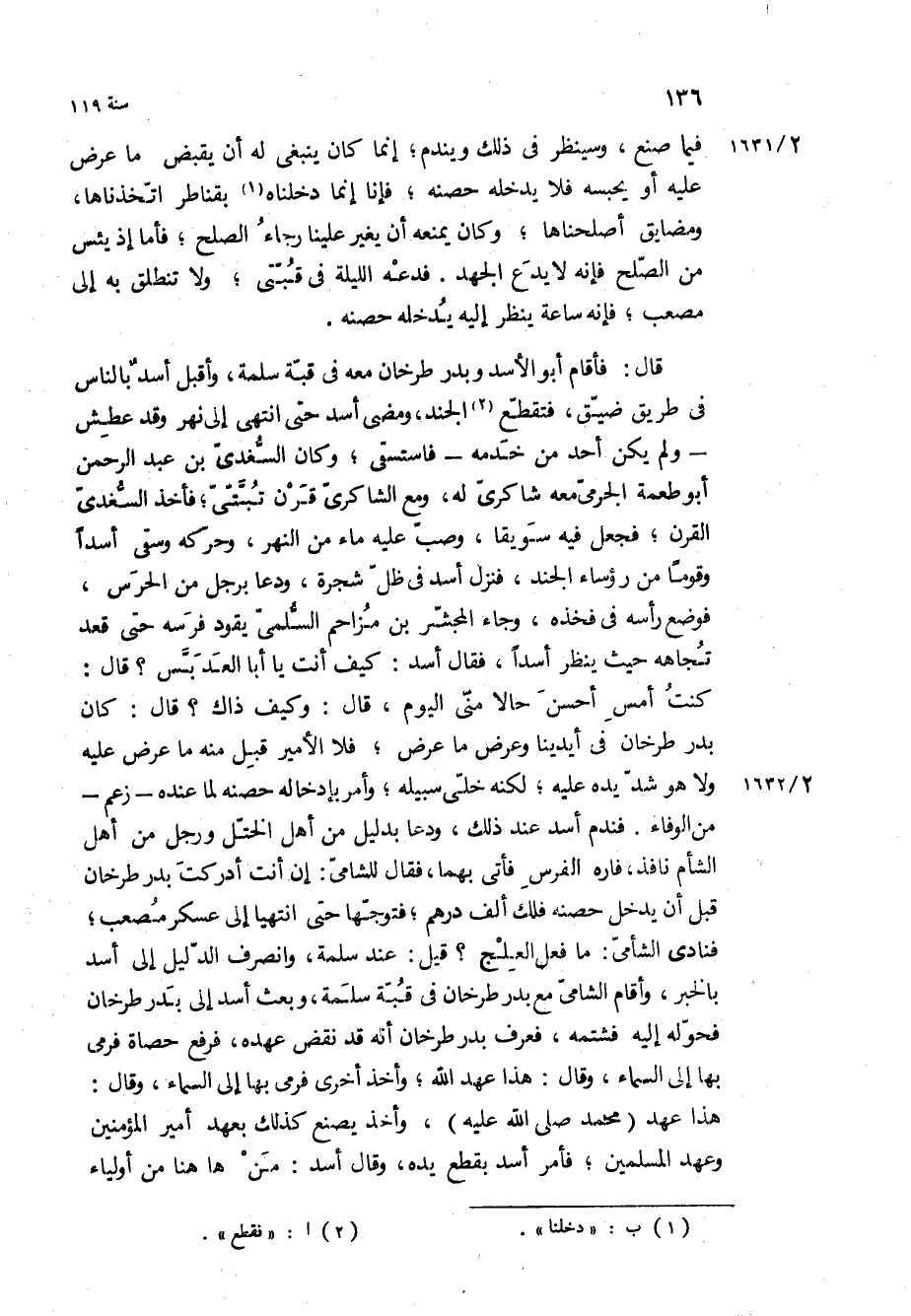 كنت أمس أحسن حالا مني اليوم، قَالَ: وكيف ذاك؟ قَالَ: كان بدر طرخان في أيدينا وعرض ما عرض، فلا الأمير قبل منه ما عرض عليه ولا هو شد يده عليه، لكنه خلى سبيله، وأمر بإدخاله حصنه لما عنده- زعم- من الوفاء فندم أسد عند ذلك، ودعا بدليل من أهل الختل ورجل من أهل الشام نافذ، فاره الفرس فأتى بهما، فقال للشامي: إن أنت أدركت بدرطرخان قبل أن يدخل حصنه فلك ألف درهم، فتوجها حتى انتهيا إلى عسكر مصعب، فنادى الشامي: ما فعل العلج؟ قيل: عند سلمة، وانصرف الدليل إلى أسد بالخبر، واقام الشامي مع بدرطرخان في قبة سلمه، وبعث اسد الى بدر طرخان فحوله اليه فشتمه، فعرف بدر طرخان أنه قد نقض عهده، فرفع حصاة فرمى بها إلى السماء، وقال: هذا عهد الله، وأخذ أخرى فرمى بها إلى السماء، وقال: