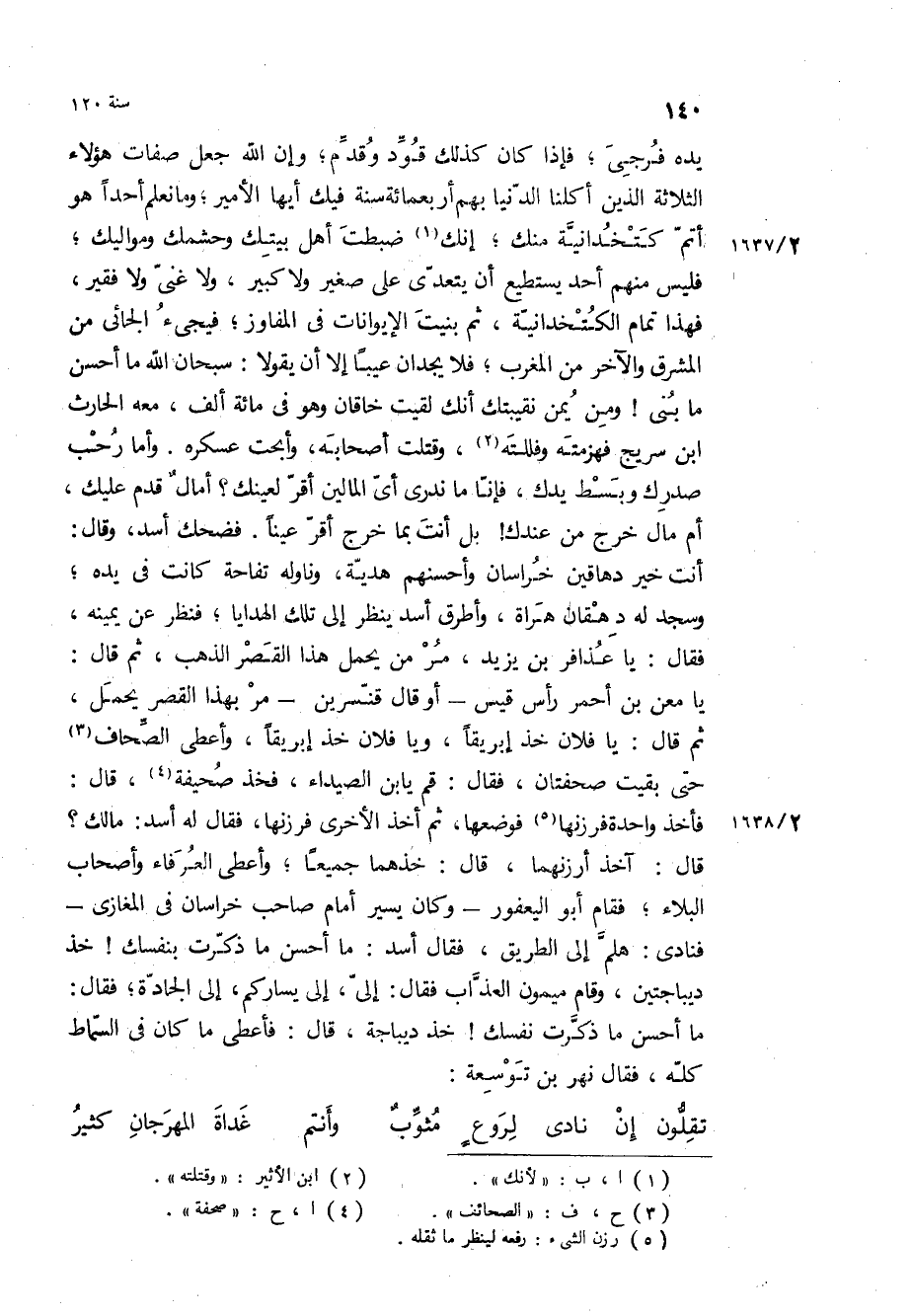 قَالَ: آخذ أرزنهما، قَالَ: خذهما جميعا، وأعطى العرفاء وأصحاب البلاء، فقام أبو اليعفور- وكان يسير أمام صاحب خراسان في المغازي- فنادى: هلم إلى الطريق، فقال أسد: ما أحسن ما ذكرت بنفسك! خذ ديباجتين، وقام ميمون العذاب فقال: إلي، إلى يساركم، إلى الجادة، فقال: