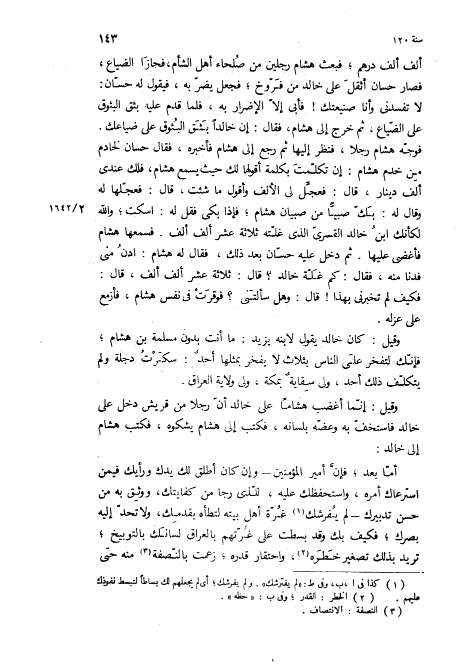 ألف ألف درهم، فبعث هشام رجلين من صلحاء اهل الشام، فحازا الضياع، فصار حسان أثقل على خالد من فروخ، فجعل يضر به، فيقول له حسان: