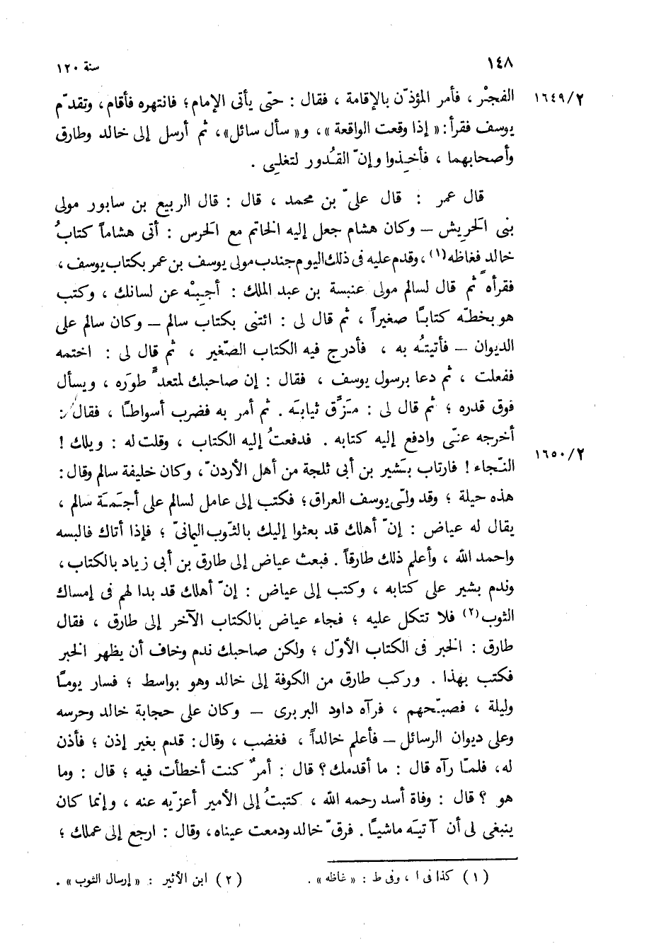 هذه حيلة، وقد ولى يوسف العراق، فكتب إلى عامل لسالم على أجمة سالم، يقال له عياض: إن أهلك قد بعثوا إليك بالثوب اليماني، فإذا أتاك فالبسه واحمد الله، وأعلم ذلك طارقا فبعث عياض إلى طارق بْن أبي زياد بالكتاب، وندم بشير على كتابه، وكتب إلى عياض: إن أهلك قد بدا لهم في إمساك الثوب فلا تتكل عليه، فجاء عياض بالكتاب الآخر إلى طارق، فقال طارق: الخبر في الكتاب الأول، ولكن صاحبك ندم وخاف أن يظهر الخبر فكتب بهذا وركب طارق من الكوفة إلى خالد وهو بواسط، فسار يوما وليلة، فصبحهم، فرآه داود البربري- وكان على حجابة خالد وحرسه وعلى ديوان الرسائل- فأعلم خالدا، فغضب، وقال: قدم بغير إذن، فأذن له، فلما رآه قَالَ: ما أقدمك؟ قَالَ: أمر كنت أخطأت فيه، قَالَ: وما هو؟ قَالَ: وفاة أسد رحمه الله، كتبت إلى الأمير أعزيه عنه، وإنما كان ينبغي لي أن آتيه ماشيا فرق خالد ودمعت عيناه، وقال: ارجع إلى عملك،