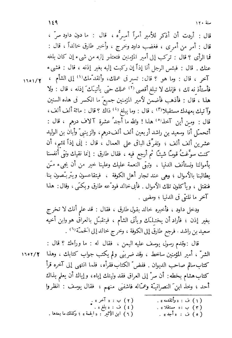 أتحمل أنا وسعيد بْن راشد أربعين ألف ألف درهم، والزينبي وأبان بْن الوليد عشرين ألف ألف، وتفرق الباقي على العمال، قَالَ: إني إذا للئيم، إن كنت سوغت قوما شيئا ثم أرجع فيه، فقال طارق: إنما نقيك ونقي أنفسنا بأموالنا ونستأنف الدنيا، وتبقى النعمة عليك وعلينا خير من أن يجيء من يطالبنا بالأموال، وهي عند تجار أهل الكوفة، فيتقاعسون ويتربصون بنا فنقتل، ويأكلون تلك الأموال فأبى خالد فودعه طارق وبكى، وقال: هذا آخر ما نلتقي في الدنيا، ومضى.