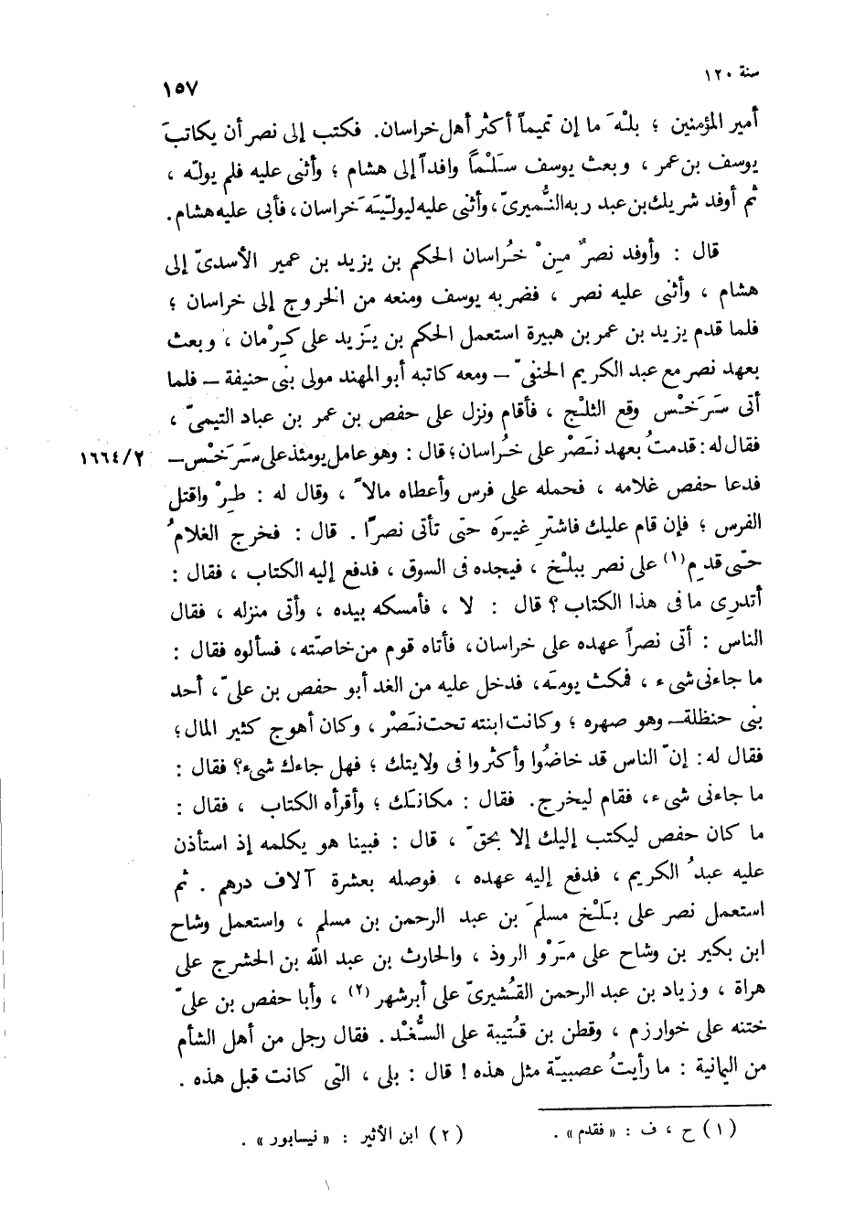 ما كان حفص ليكتب إليك إلا بحق، قَالَ: فبينا هو يكلمه إذ استأذن عليه عبد الكريم، فدفع إليه عهده، فوصله بعشرة آلاف درهم ثم استعمل نصر على بلخ مسلم بْن عبد الرحمن بن مسلم، واستعمل وشاح ابن بكير بْن وشاح على مرو الروذ، والحارث بْن عبد الله بْن الحشرج على هراة، وزياد بْن عبد الرحمن القشيري على أبرشهر، وأبا حفص بْن علي ختنه على خوارزم، وقطن بْن قتيبة على السغد فقال رجل من أهل الشام من اليمانية: ما رأيت عصبية مثل هذه! قَالَ: بلى، التي كانت قبل هذه