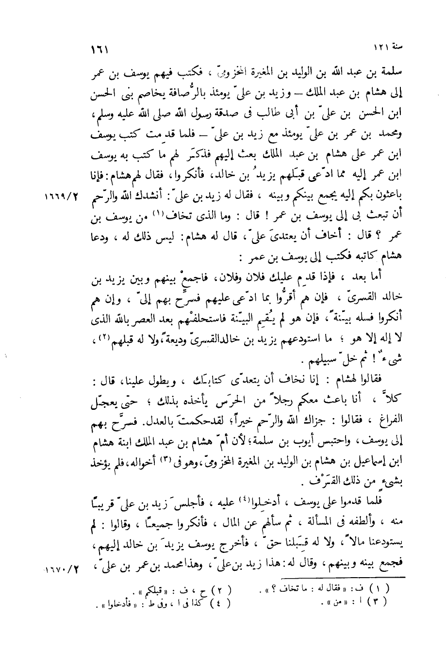 سلمة بْن عبد الله بْن الوليد بْن المغيرة المخزومي، فكتب فيهم يوسف بْن عمر إلى هشام بْن عبد الملك- وزيد بْن على يومئذ بالرصافة يخاصم بنى الحسن ابن الْحَسَنُ بْنُ عَلِيِّ بْنِ أَبِي طَالِبٍ فِي صدقه رسول الله ص، ومحمد بْن عمر بْن علي يومئذ مع زيد بْن علي- فلما قدمت كتب يوسف ابن عمر على هشام بْن عبد الملك بعث إليهم فذكر لهم ما كتب به يوسف ابن عمر إليه مما ادعى قبلهم يزيد بْن خالد، فأنكروا، فقال لهم هشام: فإنا باعثون بكم اليه يجمع بينكم وبينه، فقال له زيد بْن علي: أنشدك الله والرحم أن تبعث بي إلى يوسف بْن عمر! قَالَ: وما الذي تخاف من يوسف بْن عمر؟ قَالَ: أخاف أن يعتدي علي، قَالَ له هشام: ليس ذلك له، ودعا هشام كاتبه فكتب إلى يوسف بْن عمر: