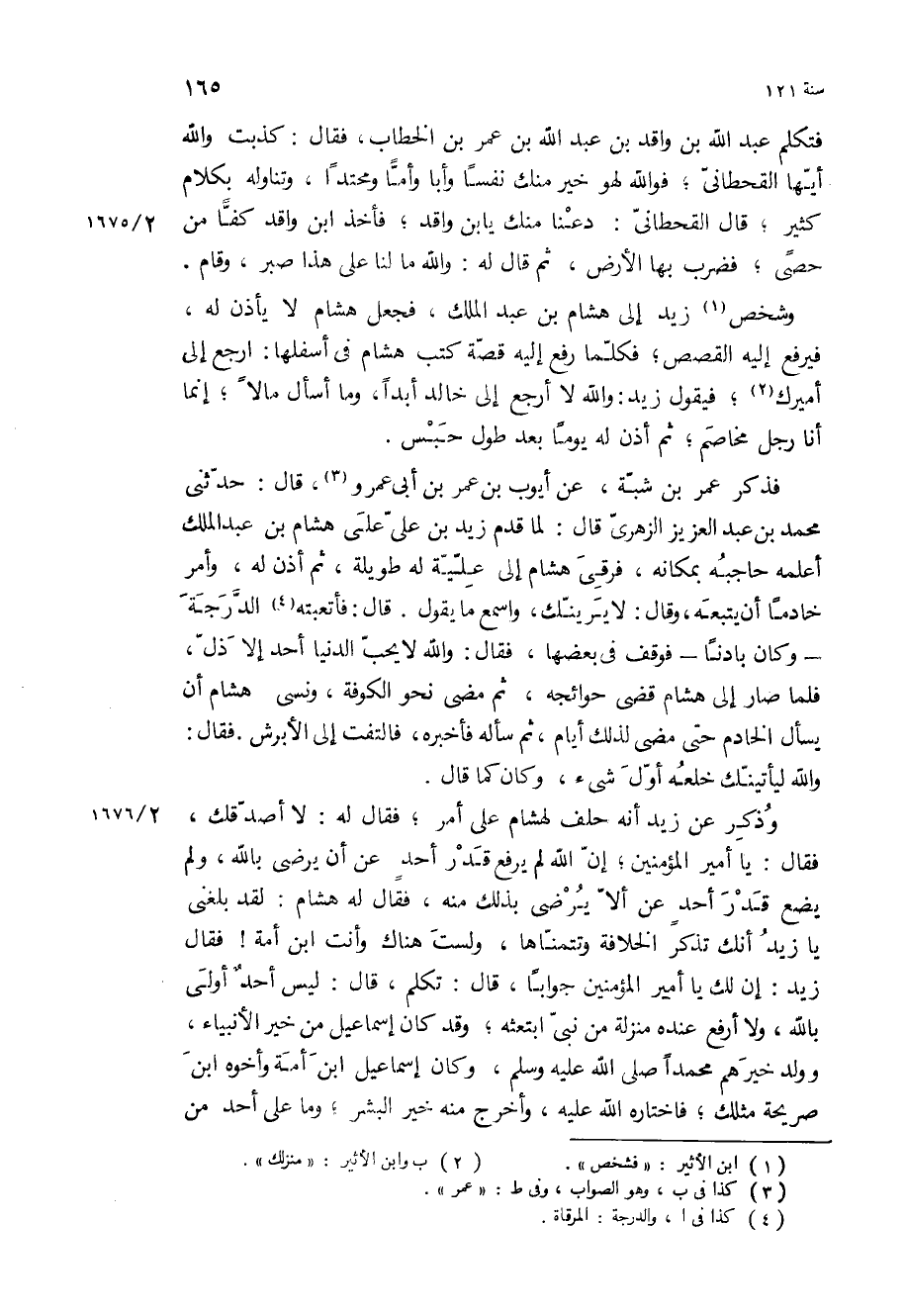 والله ليأتينك خلعه أول شيء، وكان كما قَالَ وذكر عن زيد أنه حلف لهشام على أمر، فقال له: لا أصدقك، فقال: يا أمير المؤمنين، إن الله لم يرفع قدر أحد عن أن يرضى بالله، ولم يضع قدر أحد عن ألا يرضى بذلك منه، فقال له هشام: لقد بلغني يا زيد أنك تذكر الخلافة وتتمناها، ولست هناك وأنت ابن أمة! فقال زيد: إن لك يا أمير المؤمنين جوابا، قال: تكلم، قال: ليس أحد أولى بالله، ولا أرفع عنده منزلة من نبي ابتعثه، وقد كان إسماعيل من خير الأنبياء، وولد خيرهم محمدا ص، وكان إسماعيل ابن أمة وأخوه ابن صريحة مثلك، فاختاره الله عليه، وأخرج منه خير البشر، وما على أحد من