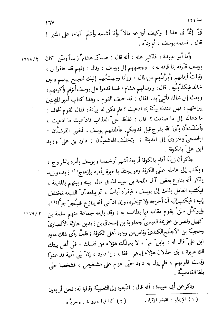 وذكر أن زيدا أقام بالكوفة أربعة أشهر أو خمسة ويوسف يأمره بالخروج، ويكتب إلى عامله على الكوفة وهو يومئذ بالحيرة يأمره بإزعاج زيد، وزيد يذكر أنه ينازع بعض آل طلحة بْن عبيد الله في مال بينه وبينهم بالمدينة، فيكتب العامل بذلك إلى يوسف، فيقره أياما، ثم يبلغه أن الشيعة تختلف إليه، فيكتب إليه أن أخرجه ولا تؤخره، وإن ادعى أنه ينازع فليجر جرا، وليوكل من يقوم مقامه فيما يطالب به، وقد بايعه جماعة منهم سلمة بْن كهيل ونصر بْن خزيمة العبسي ومعاوية بْن إسحاق بْن زيد بْن حارثة الأنصاري وحجية بْن الأجلج الكندي وناس من وجوه أهل الكوفة، فلما راى ذلك داود ابن على قال له: يا بن عم، لا يغرنك هؤلاء من نفسك، ففي أهل بيتك لك عبرة، وفي خذلان هؤلاء إياهم فقال: يا داود، إن بني أمية قد عتوا وقست قلوبهم، فلم يزل به داود حتى عزم على الشخوص، فشخصا حتى بلغا القادسية.