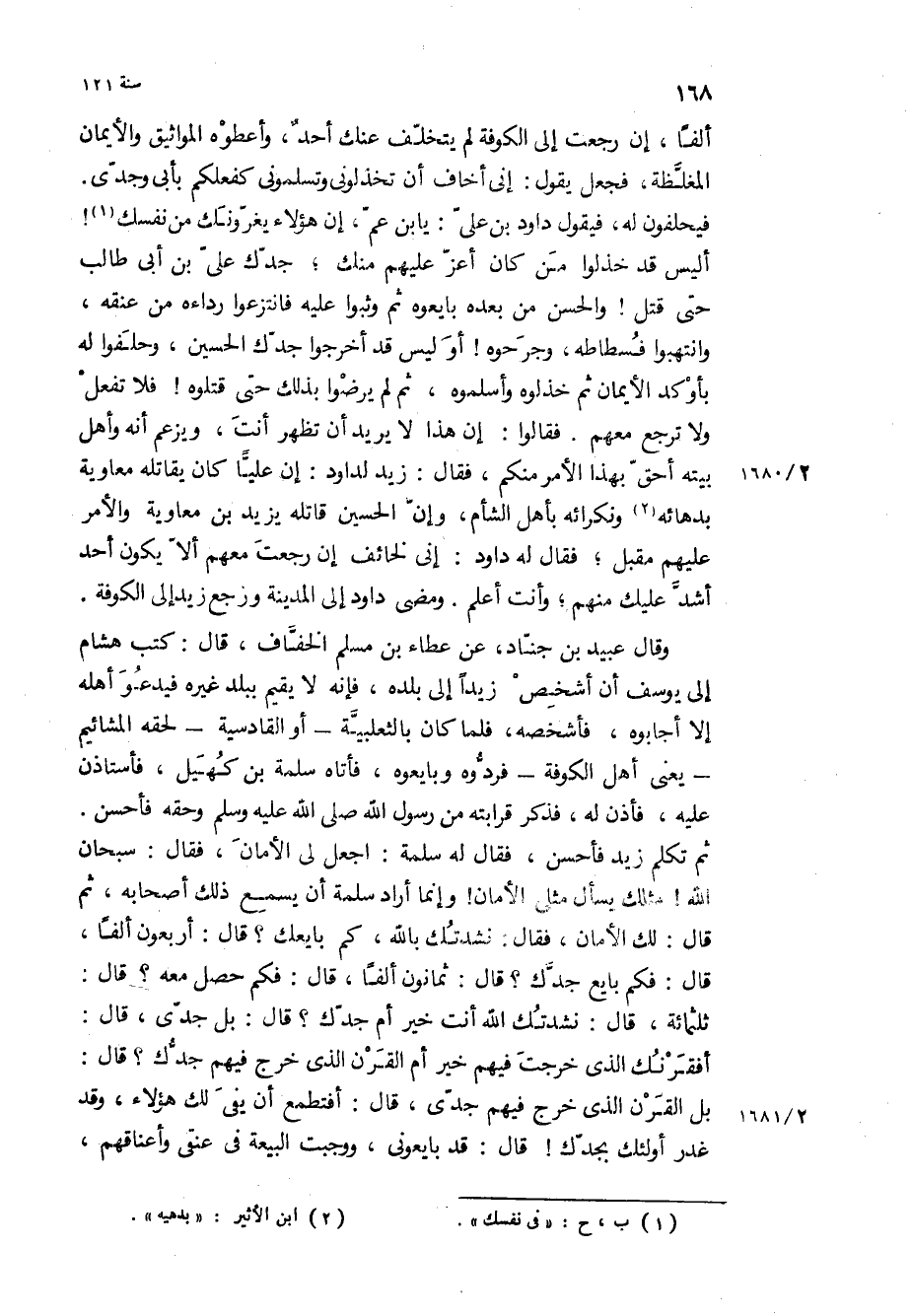 بل القرن الذي خرج فيهم جدي، قَالَ: أفتطمع أن يفي لك هؤلاء، وقد غدر أولئك بجدك! قَالَ: قد بايعوني، ووجبت البيعة في عنقي وأعناقهم،