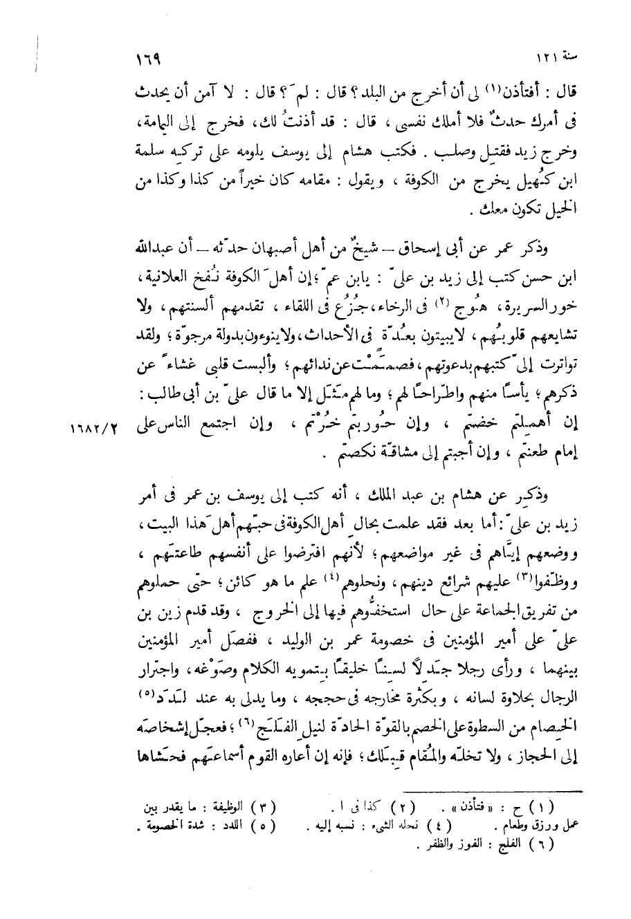 وذكر عن هشام بْن عبد الملك، أنه كتب إلى يوسف بْن عمر في أمر زيد بْن علي: أما بعد فقد علمت بحال أهل الكوفة في حبهم أهل هذا البيت، ووضعهم إياهم في غير مواضعهم، لأنهم افترضوا على أنفسهم طاعتهم، ووظفوا عليهم شرائع دينهم، ونحلوهم علم ما هو كائن، حتى حملوهم من تفريق الجماعة على حال استخفوهم فيها إلى الخروج، وقد قدم زين بْن علي على أمير المؤمنين في خصومة عمر بْن الوليد، ففصل أمير المؤمنين بينهما، وراى رجلا جدلا لسنا خليقا بتمويه الكلام وصوغه، واجترار الرجال بحلاوة لسانه، وبكثرة مخارجه في حججه، وما يدلي به عند لدد الخصام من السطوة على الخصم بالقوة الحادة لنيل الفلج، فعجل إشخاصه إلى الحجاز، ولا تخله والمقام قبلك، فإنه إن أعاره القوم أسماعهم فحشاها