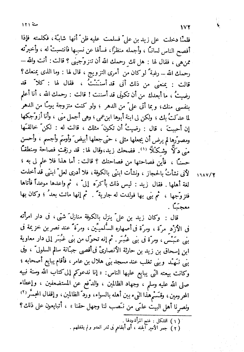 فلما دخلت على زيد بْن علي فسلمت عليه ظن أنها شابة، فكلمته فإذا أفصح الناس لسانا، وأجمله منظرا، فسألها عن نسبها فانتسبت له، وأخبرته ممن هي، فقال لها: هل لك رحمك الله أن تتزوجيني؟ قالت: أنت والله- رحمك الله- رغبة لو كان من أمري التزويج، قَالَ لها: وما الذي يمنعك؟