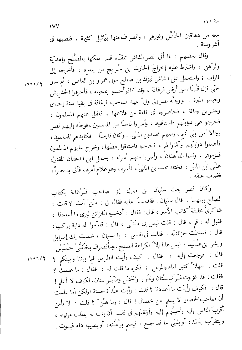 وقال بعضهم: لما أتى نصر الشاش تلقاه قدر ملكها بالصلح والهدية والرهن، واشترط عليه إخراج الحارث بْن سريج من بلده، فأخرجه إلى فاراب، واستعمل على الشاش نيزك بْن صالح مولى عمرو بْن العاص، ثم سار حتى نزل قباء من أرض فرغانة، وقد كانوا أحسوا بمجيئه، فأحرقوا الحشيش وحبسوا الميرة ووجه نصر إلى ولي عهد صاحب فرغانة في بقية سنة إحدى وعشرين ومائة، فحاصروه في قلعة من قلاعها، فغفل عنهم المسلمون، فخرجوا على دوابهم فاستاقوها، وأسروا ناسا من المسلمين، فوجه إليهم نصر رجالا من بني تميم، ومعهم محمد بن المثنى- وكان فارسا- فكايدهم المسلمون، فأهملوا دوابهم وكمنوا لهم، فخرجوا فاستاقوا بعضها، وخرج عليهم المسلمون فهزموهم، وقتلوا الدهقان، وأسروا منهم أسراء، وحمل ابن الدهقان المقتول على ابن المثنى، فختله محمد بْن المثنى، فأسره، وهو غلام أمرد، فأتى به نصرا، فضرب عنقه.