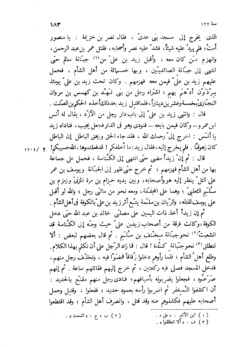 قَالَ: وانتهى زيد بْن علي إلى باب دار رجل من الأزد، يقال له أنس ابن عمرو- وكان فيمن بايعه- فنودي وهو في الدار فجعل يجيب، فناداه زيد يا أنس: اخرج إلي رحمك الله، فقد جاءَ الْحَقُّ وَزَهَقَ الْباطِلُ إِنَّ الْباطِلَ كانَ زَهُوقاً فلم يخرج إليه، فقال زيد: ما أخلفكم! قد فعلتموها، الله حسيبكم! قَالَ: ثم إن زيدا مضى حتى انتهى إلى الكناسة، فحمل على جماعة بها من أهل الشام فهزمهم، ثم خرج حتى ظهر إلى الجبانة ويوسف بْن عمر على التل ينظر إليه هو وأصحابه، وبين يديه حزام بْن مرة المزني وزمزم بْن سليم الثعلبي، وهما على المجففة، ومعه نحو من مائتي رجل، والله لو أقبل على يوسف لقتله، والريان بْن سلمة يتبع أثر زيد بْن علي بالكوفة في أهل الشام.