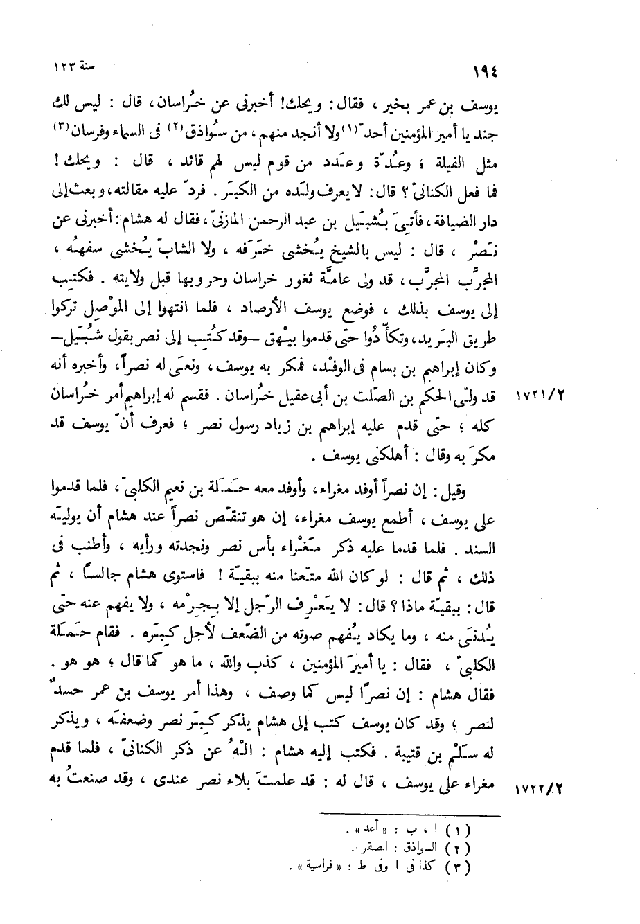 يوسف بْن عمر بخير، فقال: ويحك! أخبرني عن خراسان، قَالَ: ليس لك جند يا امير المؤمنين احد ولا انجد منهم، من سواذق في السماء وفرسان مثل الفيله، وعدة وعدد من قوم ليس لهم قائد، قَالَ: ويحك! فما فعل الكناني؟ قَالَ: لا يعرف ولده من الكبر فرد عليه مقالته، وبعث إلى دار الضيافة، فأتي بشبيل بْن عبد الرحمن المازني، فقال له هشام: أخبرني عن نصر، قَالَ: ليس بالشيخ يخشى خرفه، ولا الشاب يخشى سفهه، المجرب المجرب، قد ولي عامة ثغور خراسان وحروبها قبل ولايته فكتب إلى يوسف بذلك، فوضع يوسف الأرصاد، فلما انتهوا إلى الموصل تركوا طريق البريد، وتكادوا حتى قدموا بيهق- وقد كتب إلى نصر بقول شبيل- وكان إبراهيم بْن بسام في الوفد، فمكر به يوسف، ونعى له نصرا، وأخبره أنه قد ولى الحكم بْن الصلت بْن أبي عقيل خراسان فقسم له ابراهيم امر خراسان كله، حتى قدم عليه إبراهيم بْن زياد رسول نصر، فعرف أن يوسف قد مكر به وقال: أهلكني يوسف.