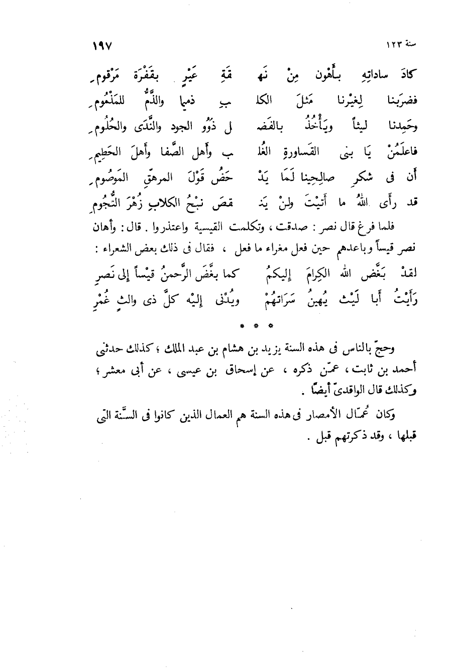 وحج بِالنَّاسِ فِي هَذِهِ السنة يَزِيد بْن هشام بْن عبد الملك، كذلك حَدَّثَنِي أَحْمَدُ بْن ثَابِت، عمن ذكره، عن إسحاق بْن عيسى، عن أبي معشر، وكذلك قَالَ الواقدي أيضا.