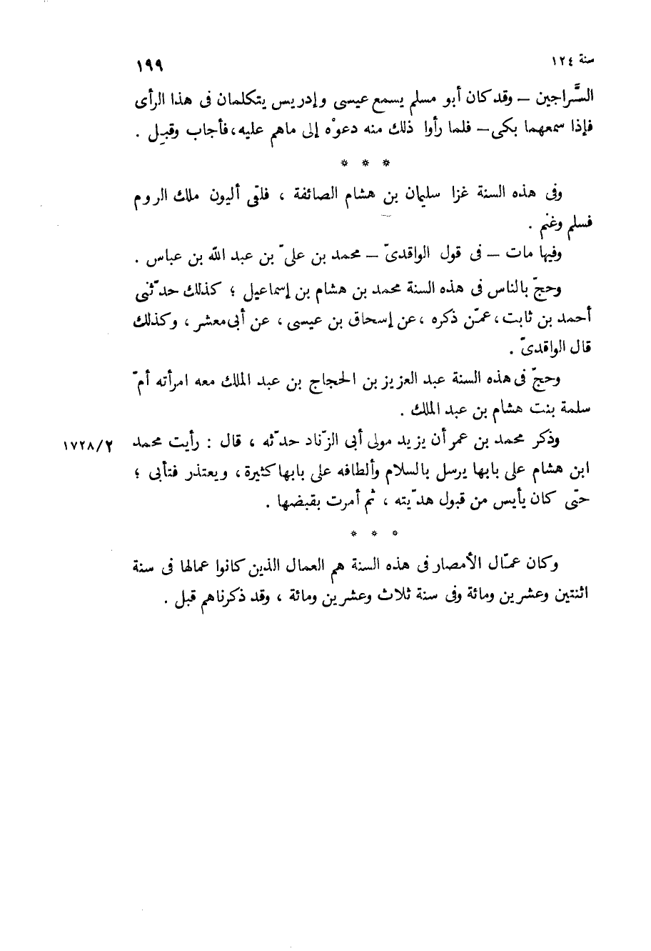 وفيها مات- في قول الواقدي- محمد بْن عَلِيّ بْن عَبْدِ اللَّهِ بْنِ عباس وحج بالناس في هذه السنة محمد بْن هشام بْن إسماعيل، كذلك حَدَّثَنِي أَحْمَدُ بْن ثَابِت، عمن ذكره، عن إسحاق بْن عيسى، عن أبي معشر، وكذلك قَالَ الواقدي.